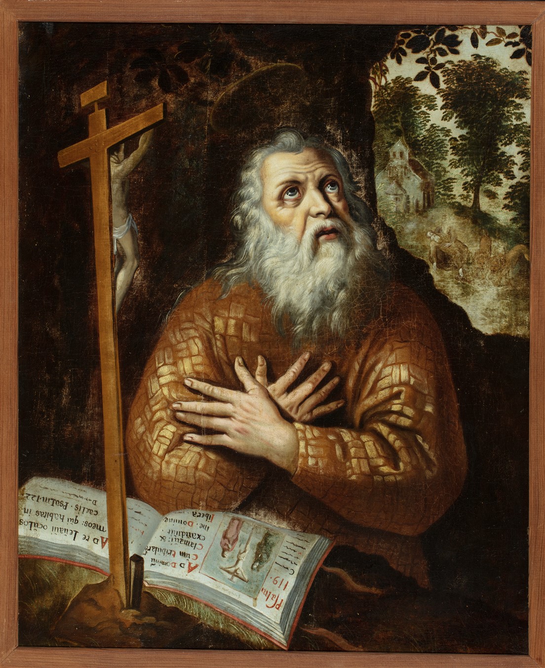 Op de linkerpagina van het boek ter weerszijden van een Kruisigingsvoorstelling: Psalm / 119: en: Ad dominu / cum tribularer / clamaui: & / exaudiuit • / me. domine / libera (Ps. 120:1-2. Tot de Heer in al mijn benauwdheid riep ik, en hij heeft mij verhoord. Heer, bevrijd ...). Op de rechterpagina: Ad te ...