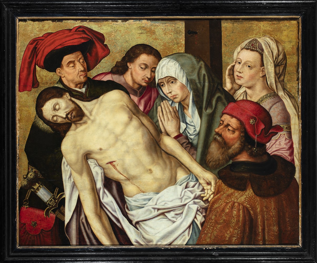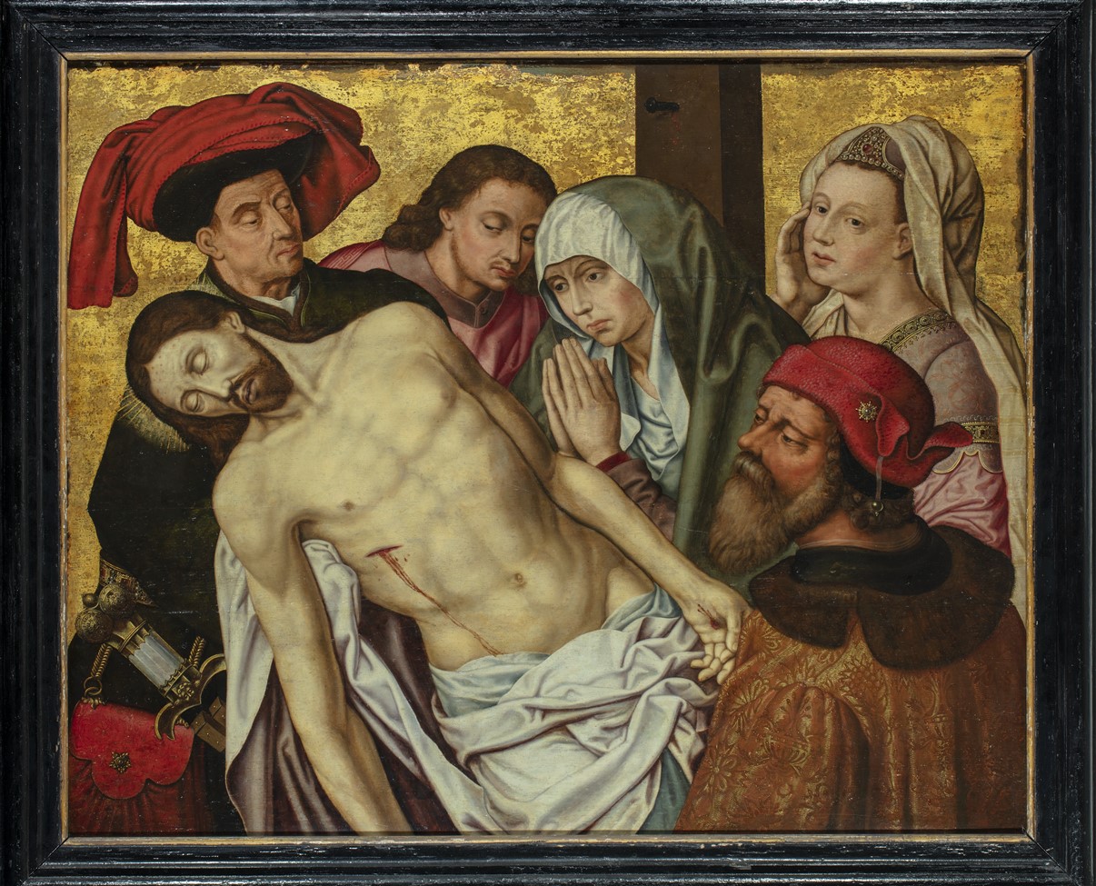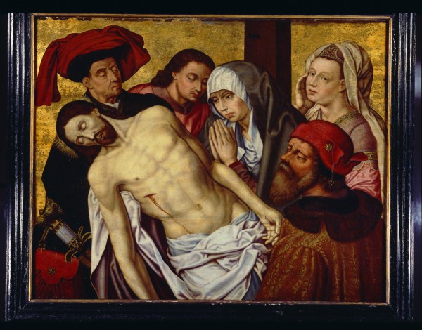 Tegen een gouden achtergrond wordt het dode lichaam van Christus aan de bovenzijde ondersteund door Jozef van Arimatea en aan de onderzijde door Nikodemus. Direkt achter hen staan Johannes, Maria en Maria Magdalena. Maria heeft de handen gevouwen en kijkt naar haar zoon. Achter haar is de kruispaal zichtbaar. De personages zijn afgebeeld als driekwart- ...
