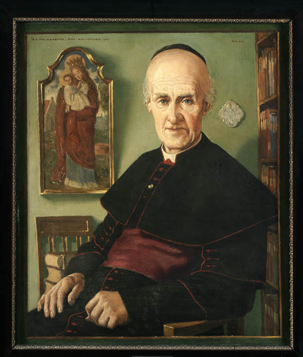 Gesigneerd en gedateerd linksboven: TH MOLKENBOER PINX AMSTERDAM 1907 . Rechtsboven: ÆT 62 [sic]. Aan de wand rechts de bedevaartmedaille van Heiloo met een afbeelding van Willibrordus en de letters SW; links een schilderij van Molkenboer met Onze-Lieve-Vrouw ter Nood van Heiloo.