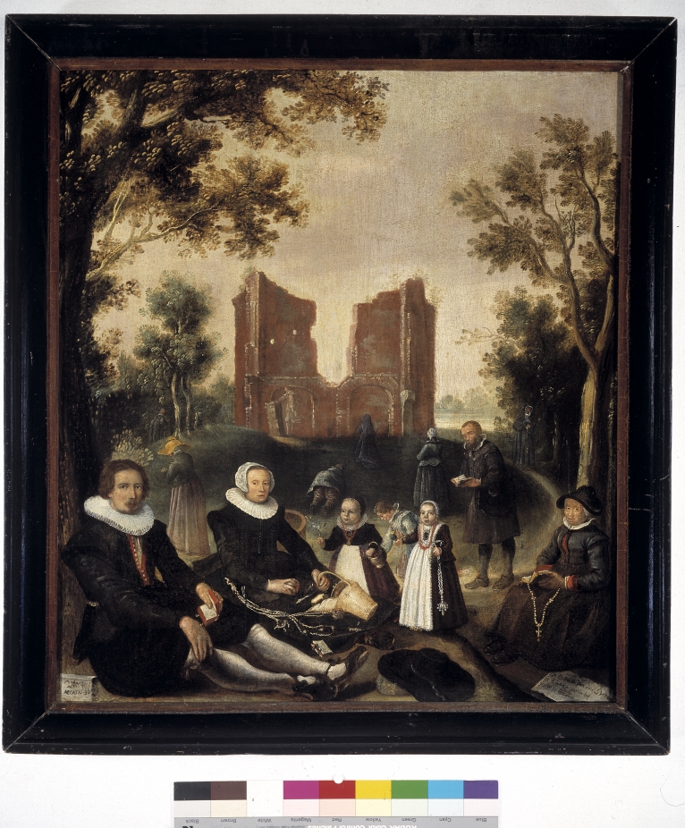 Portret van een familie voor de ruïne van de kapel van Onze-Lieve-Vrouw ter Nood te Heiloo