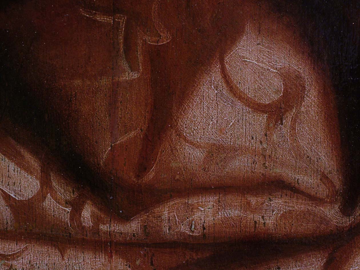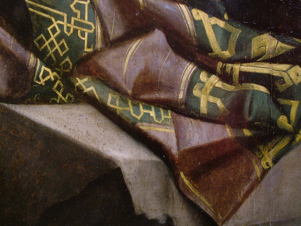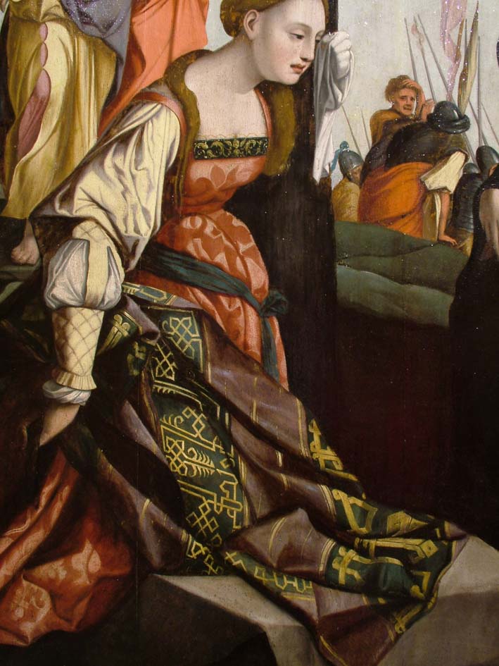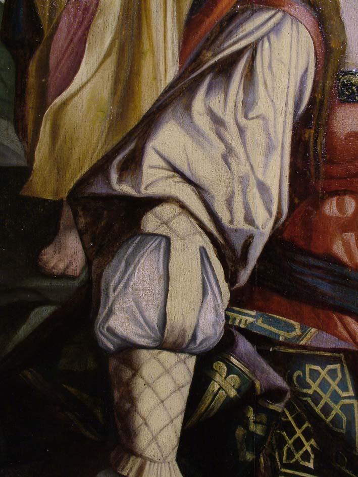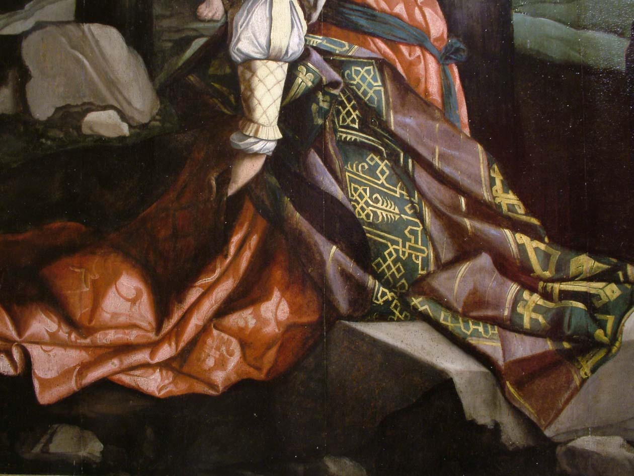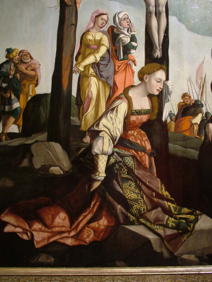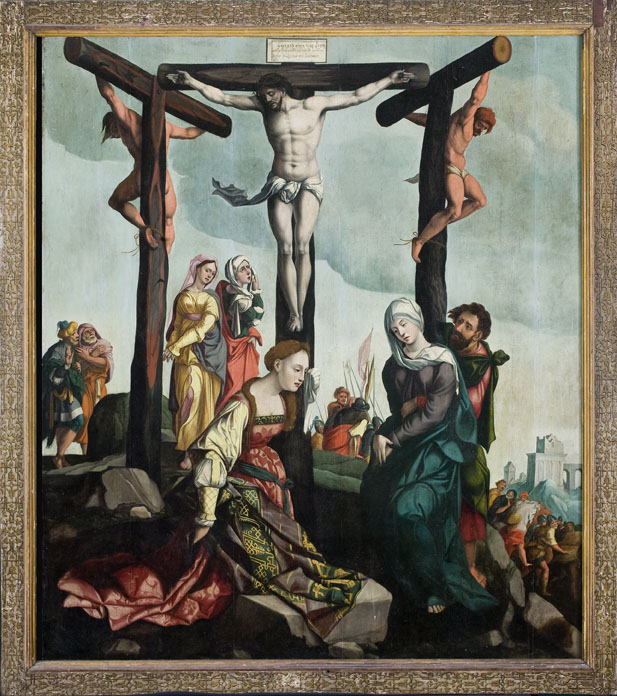 Op de Calvarieberg hangt Christus aan het kruis, geflankeerd door de twee moordenaars. De kruisen van de moordenaars staan van Christus afgekeerd. In het midden op de voorgrond zit Maria Magdalena. Ze omarmt de kruispaal. Rechts wordt Maria ondersteund door Johannes. Achter de kruisen staan de beide andere Maria's. Op de achtergrond links twee oudere ...