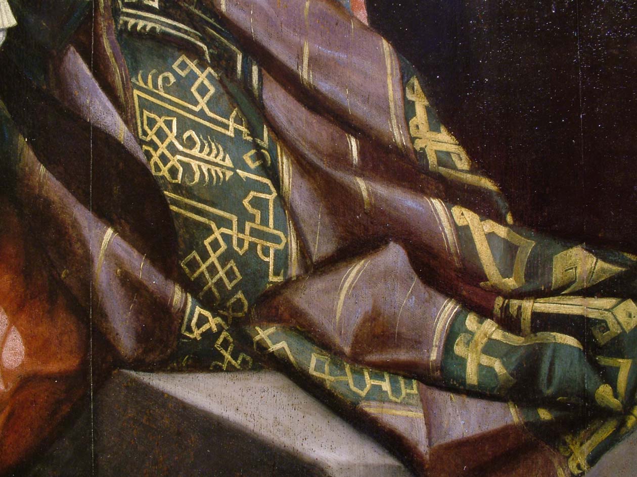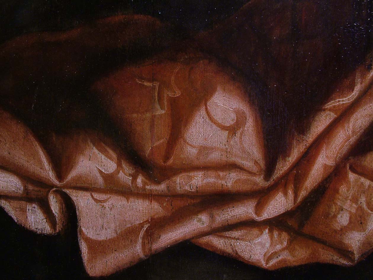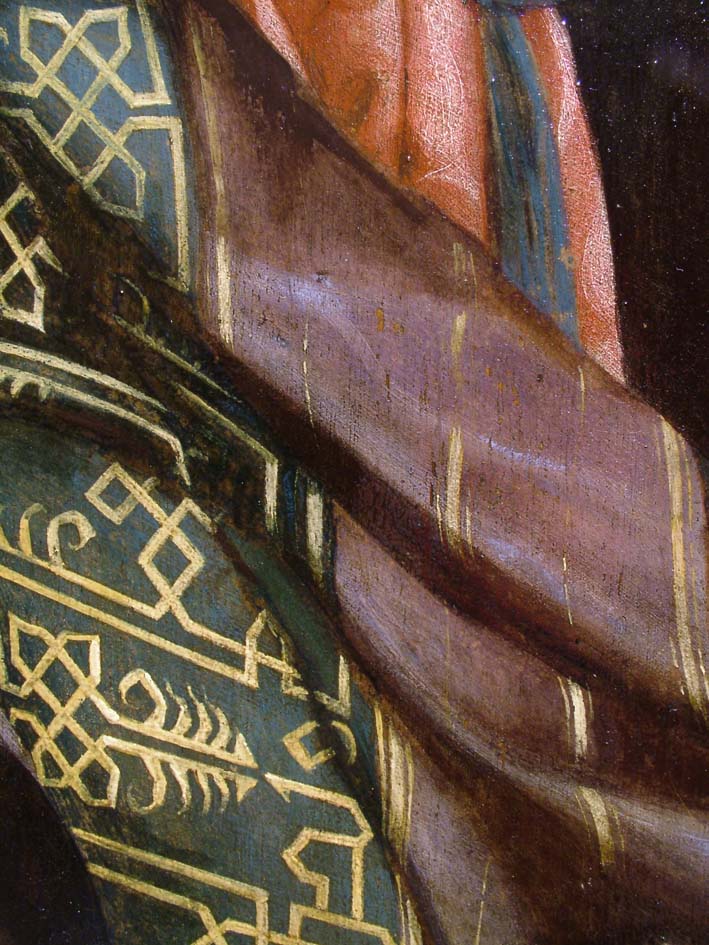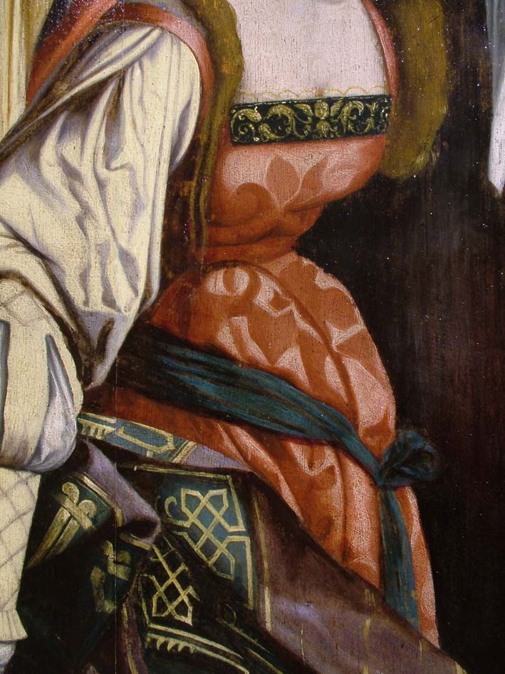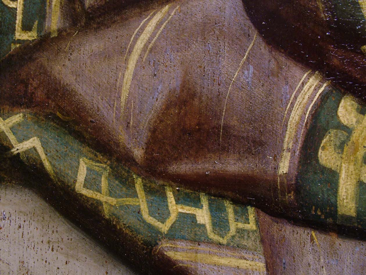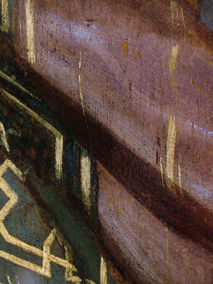 Op de Calvarieberg hangt Christus aan het kruis, geflankeerd door de twee moordenaars. De kruisen van de moordenaars staan van Christus afgekeerd. In het midden op de voorgrond zit Maria Magdalena. Ze omarmt de kruispaal. Rechts wordt Maria ondersteund door Johannes. Achter de kruisen staan de beide andere Maria's. Op de achtergrond links twee oudere ...