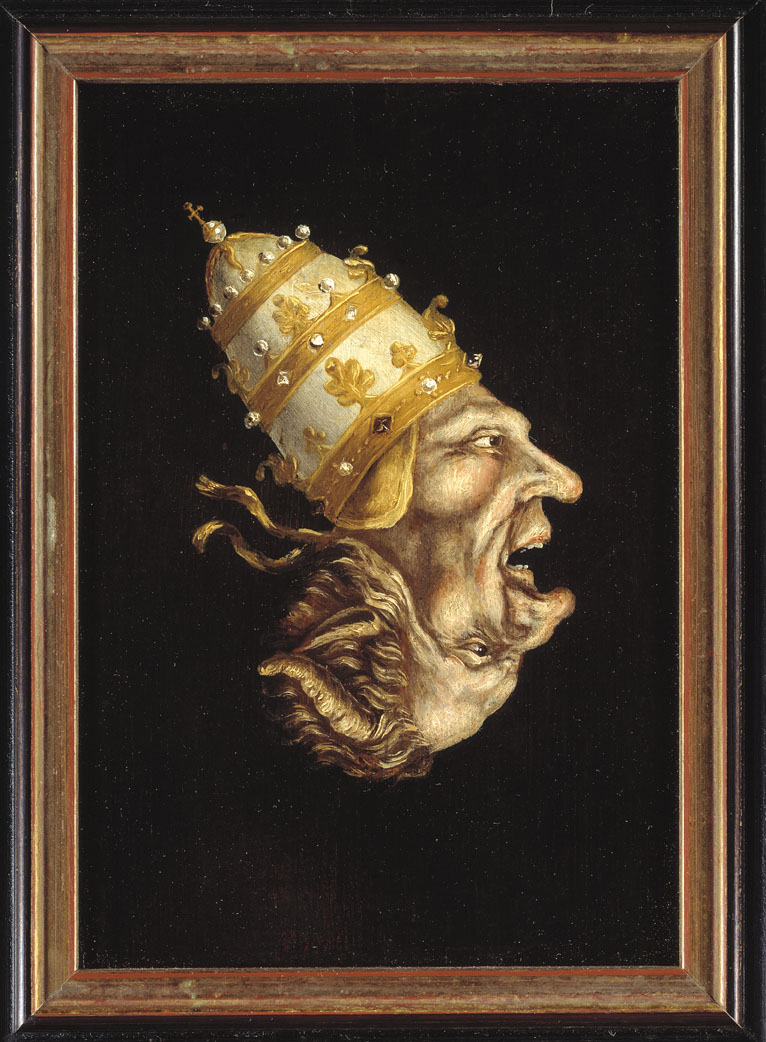 De kop van een paus verandert in een duivelskop wanneer het paneel honderdtachtig graden wordt gedraaid.
