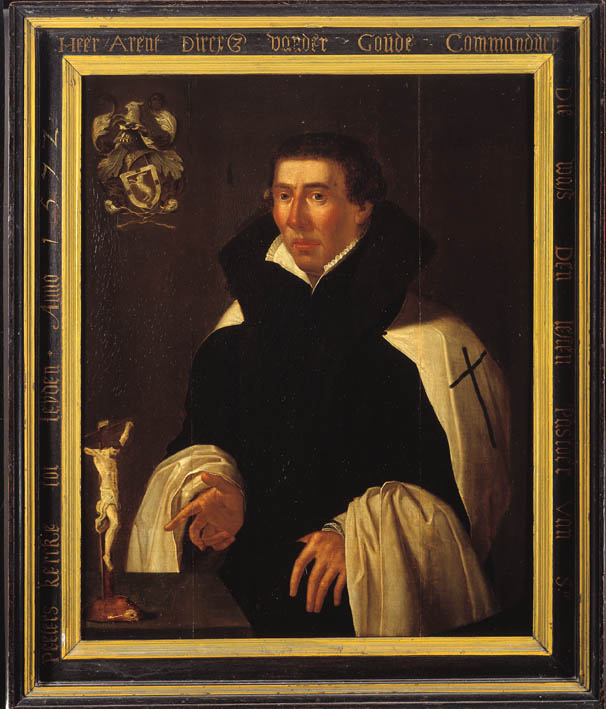 Linksboven Bockenberghs wapen; rechtsboven zijn leeftijd: ÆTATIS 45. Op de originele lijst het opschrift: Heer Arent Dircxz vander Goude. Commanduer. / Die was Den lesten Pastoer van S(in)te / Peeters kercke tot Leyden + Anno 1572.
