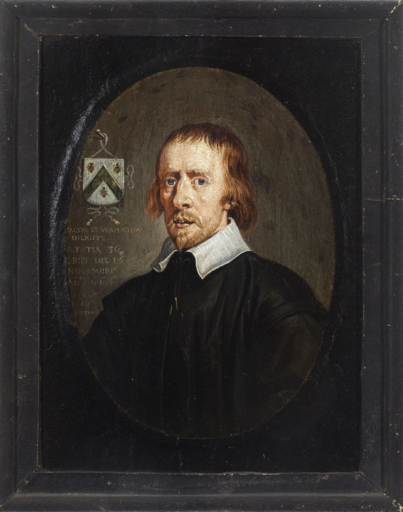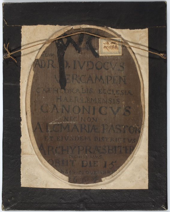 Linksboven Verkampens familiewapen met het devies PACEM ET VERITATEM / DILIGITE (Bemint vrede en waarheid). Daaronder het opschrift: AETATIS 36 / OBIIT DIE 15 / NOVEMBRIS / AN° 1664 / M. BERGH / AD MORTVVM (Overleden op 15 november 1664, 36 jaar oud; M. Bergh, [portret] naar de overledene). Op de achterzijde de tekst: ‘Adr.O[?]. ...