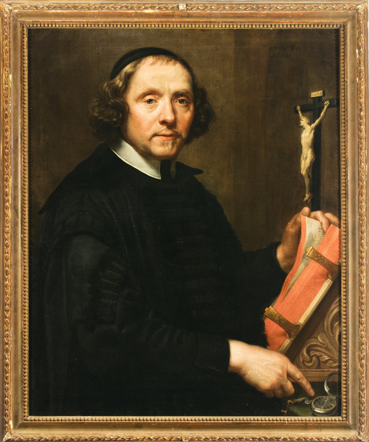 Gesigneerd rechtsonder op de rand van de lezenaar: io. s v. hoeven. P. Gedateerd rechtsboven: Ætatis: 50. / .1663. De identiteit van de schilder staat niet vast. Betreft het Johannes Verhoeven, de Mechelse historieschilder, of Joris van Hoeven die alleen bekend is van een gesigneerd portret uit 1676: ‘Jor. v. Hoeven P’ (Thieme/Becker 17, p. ...