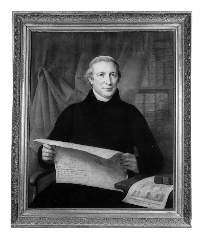 Rechts op de boekenplank gesigneerd en gedateerd: A. de Lelie f [...] Aº 18[20?]. In zijn handen houdt Van der Lugt een blad papier met daarop aan de voorzijde de plattegrond van de Catharinakerk in Amsterdam; aan de achterzijde het opschrift: Plattegrond van het nieuwe / R.C. Kerkgebouw, waarvan de Eerste steen / gelegd is ...