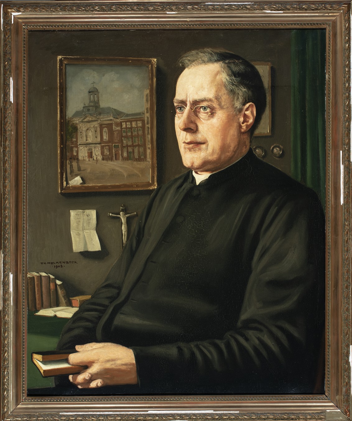 Gesigneerd en gedateerd links: TH. MOLKENBOER / ? 1908?. Op het schilderij aan de muur een afbeelding van de Catharinakerk aan de Singel in Amsterdam.