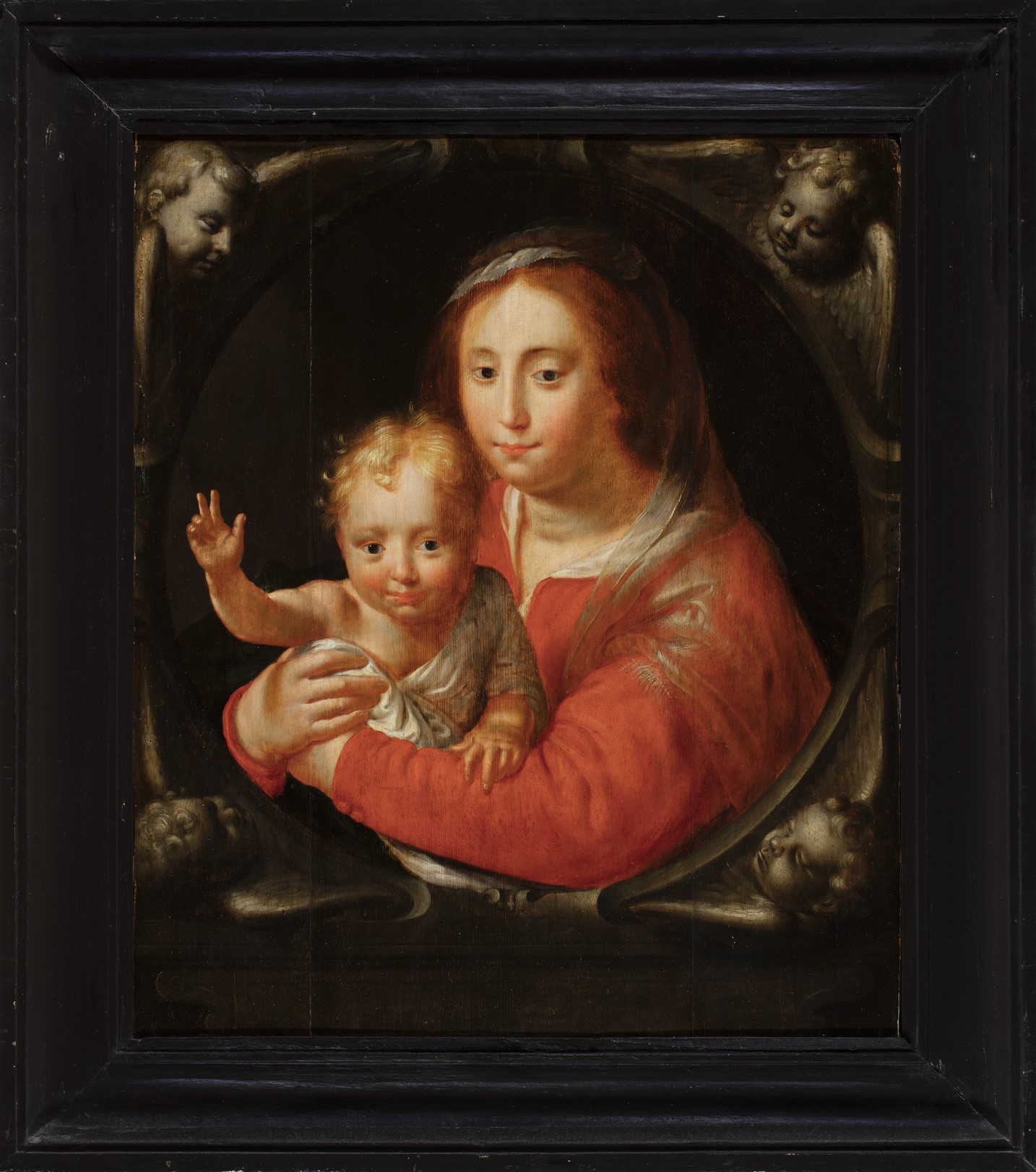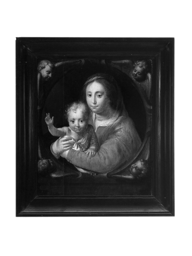 De figuren zijn gevat in een ovale omlijsting versierd met in grisaille geschilderde engelkopjes. Op de achterzijde een (geschilderd ?) merkteken in zwart, bestaande uit een hoofdletter ‘M’ met daarboven in het midden een omgekeerde ‘4’ voorzien van een dwarsstreep op de horizontale stok en een rondje op de vertikale stok.