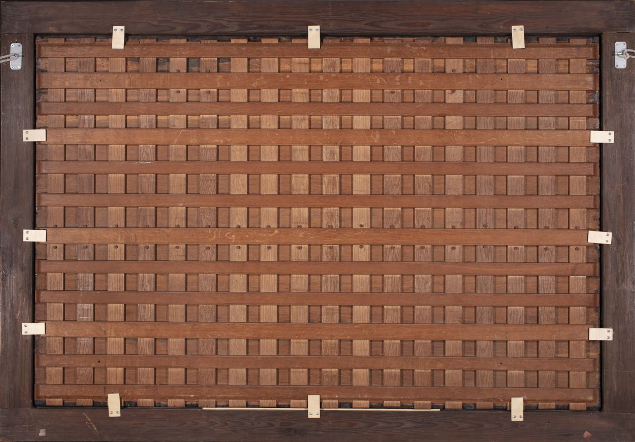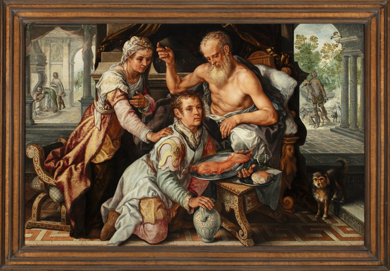 Gemonogrammeerd op de rugleuning van de stoel: ? IB ?; gedateerd op de plaquette achter de opgeheven arm van Isaak: 1568. Rebekka en Jakob hebben Isaak het geitenbokje gebracht dat zij links op de achtergrond aan het toebereiden zijn. Op de achtergrond rechts Esau die terugkeert van de jacht.