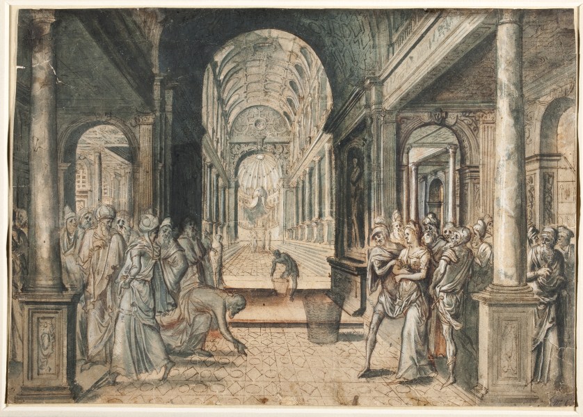Christus schrijft op de tempelvloer in pseudo-Hebreeuwse letters de woorden die hij bij deze gelegenheid sprak: ‘Wie van u zonder zonde is, werpe de eerste steen’ (Joh. 8:7). Op de achtergrond Christus in dispuut met schriftgeleerden en Farizeeërs voor een altaar met de Ark des Verbonds en de twee wetstafelen.