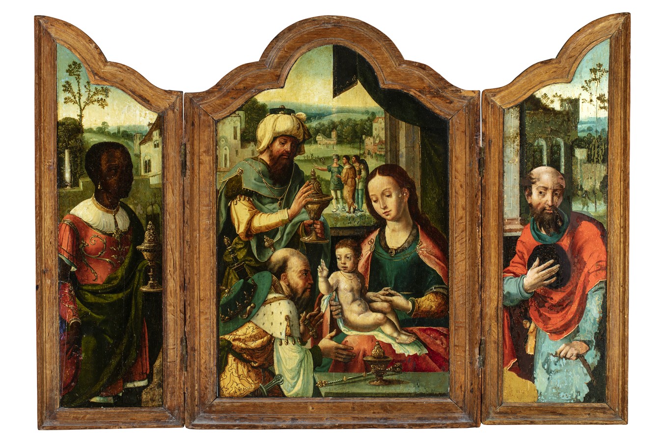 Op het middenpaneel Maria met kind en twee van de drie koningen, op het linkerluik de derde koning, op het rechterluik Jozef.