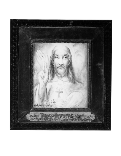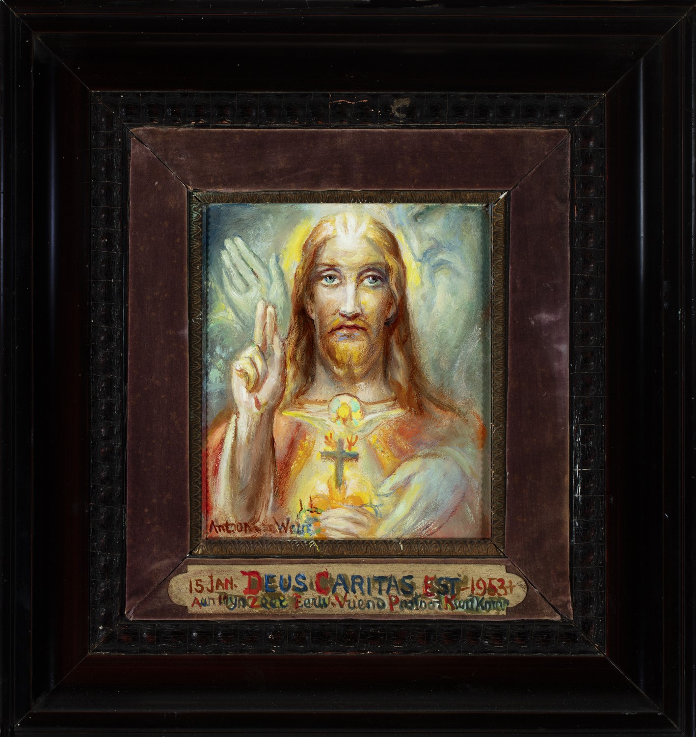 Gesigneerd linksonder: Antoon van Welie. Gedateerd op de fluwelen binnenlijst met daarbij de tekst: 15 Jan. DEUS CARITAS EST (God is liefde) 1953 / Aan mijn zeer Eerw. Vriend Pastoor Kwakman.
