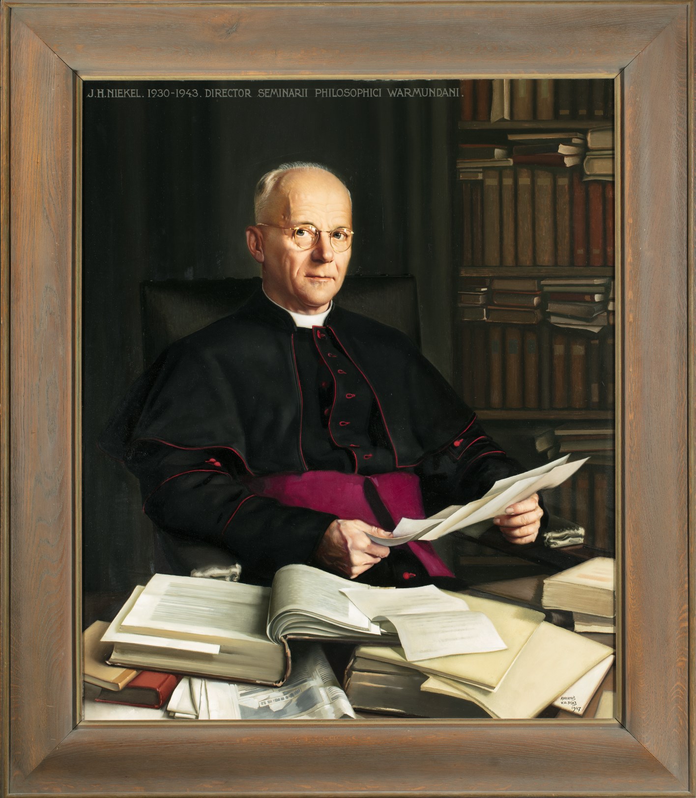 Gesigneerd en gedateerd rechtsonder: ADRIANUS / V.D. PLAS / 1947. Opschrift bovenaan: J.H.NIEKEL. 1930-1943. DIRECTOR SEMINARII PHILOSOPHICI WARMUNDANI. Het werk is geschilderd op dun linnen, geplakt op triplex.