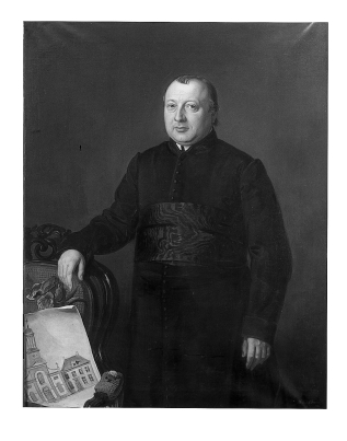 Portret van Henricus van Luenen (1813-1876), met ontwerptekening van kerk en pastorie te Achthuizen