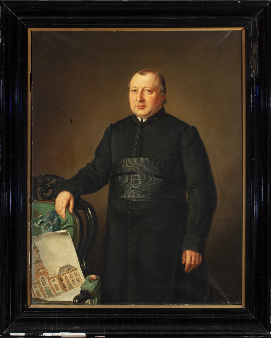 Rechtsonder gesigneerd en gedateerd: Martinus.C. Schenk. / 1864. Op de stoel links een vooraanzicht van een ontwerp voor de kerk kerk en pastorie te Achthuizen.