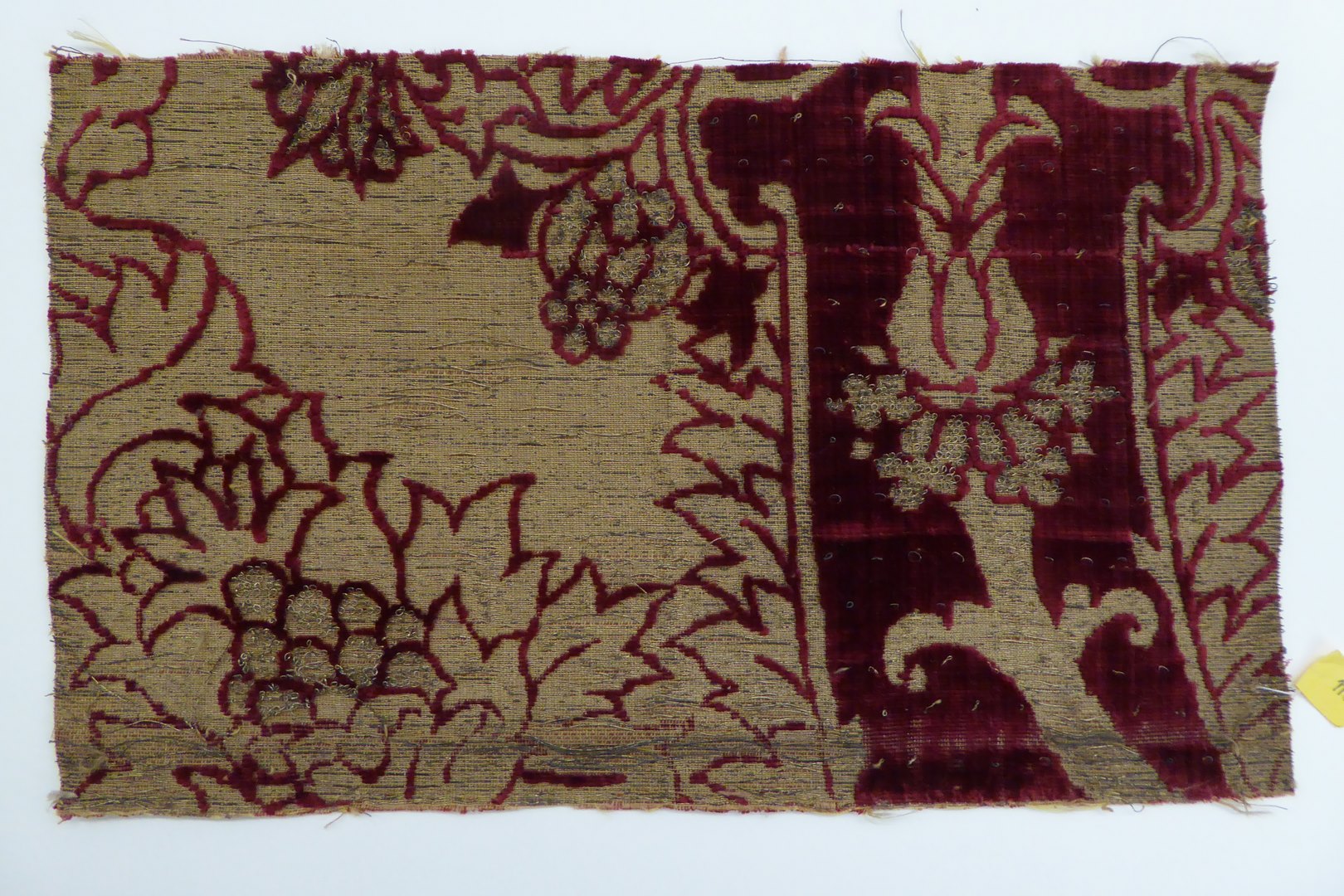 Op een effen gouden grond zijn met rode zijde plantaardige motieven uitgebeeld. Techniek: de grond is van gouddraad in inslaglancé, de motieven met gesneden pool zijn van rode zijde, de motieven met ongesneden pool van rode zijde en gouddraad (gouddraad ciselé).