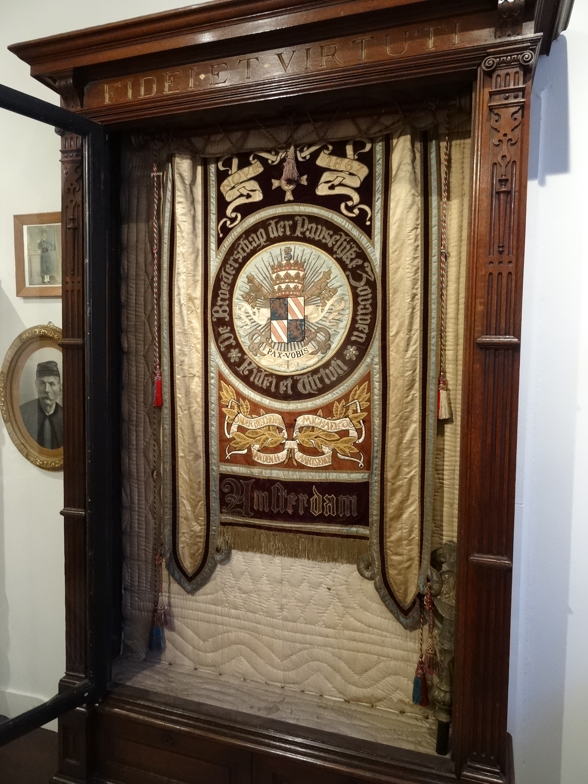 Vaandel met "De broederschap der pauselijke zouaven Fidei et Virtuti", wapen Pius IX, tiara, sleutels, "Pax Vobis", "Amsterdam", "1867"
