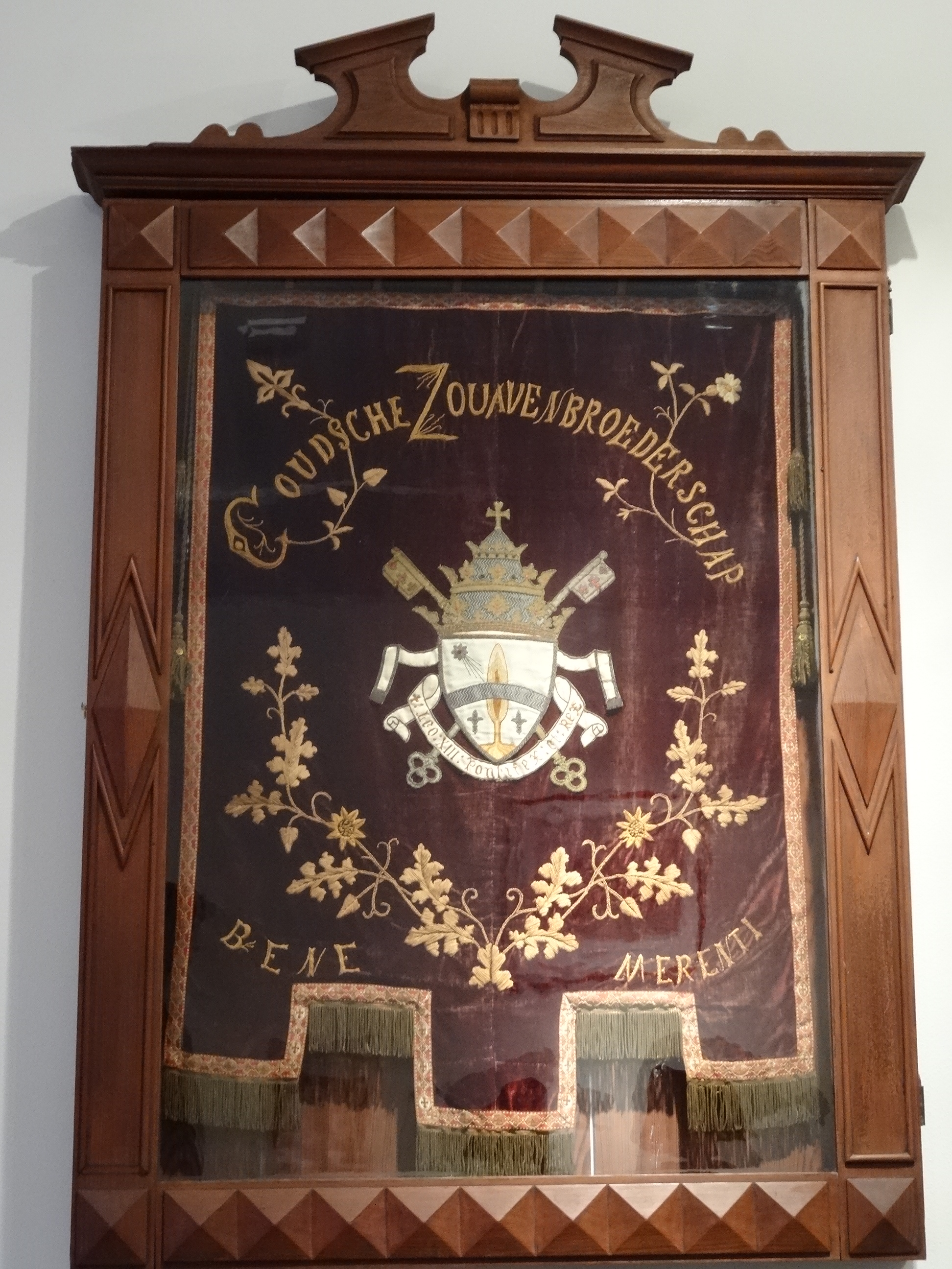Rood vaandel Goudse Zouaven Broederschap "Bene Merenti", wapen Leo XIII, tiara, sleutels, in kast