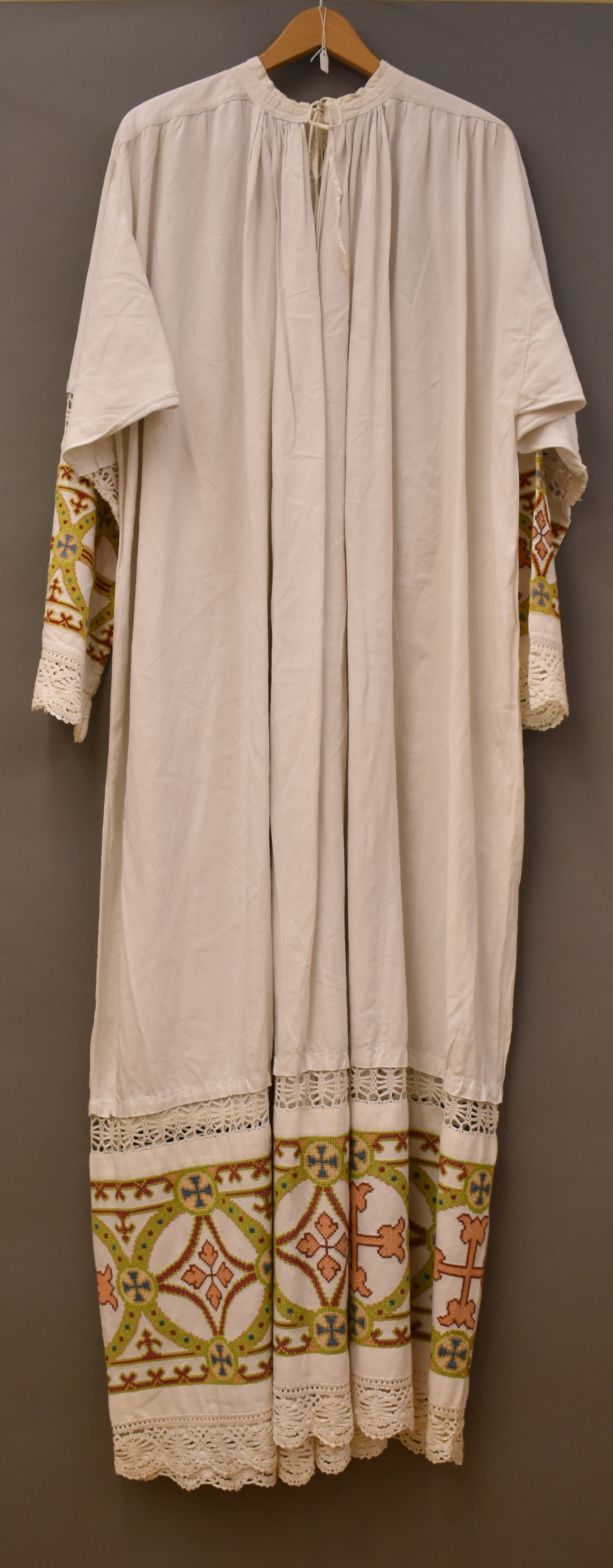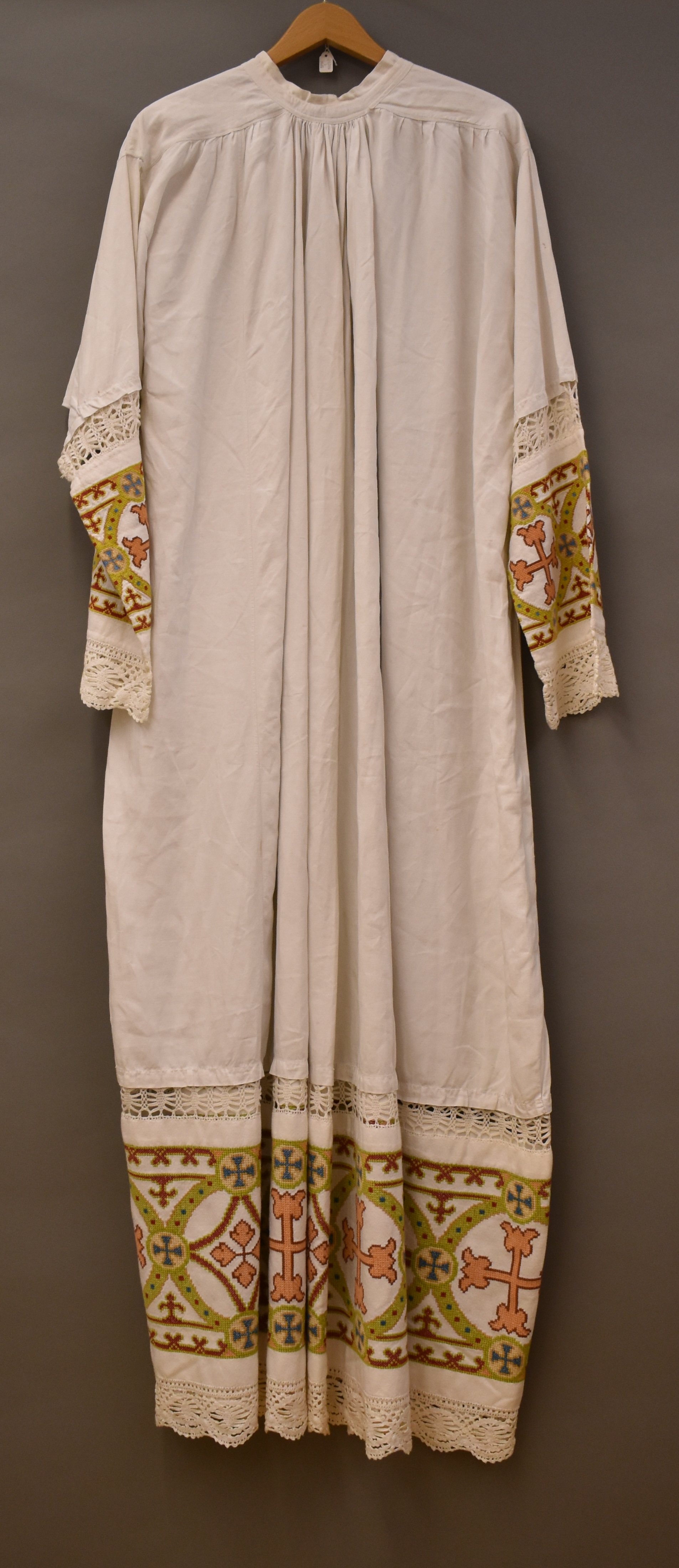 Albe in kruissteek geborduurd met roze kruisen in groene cirkels