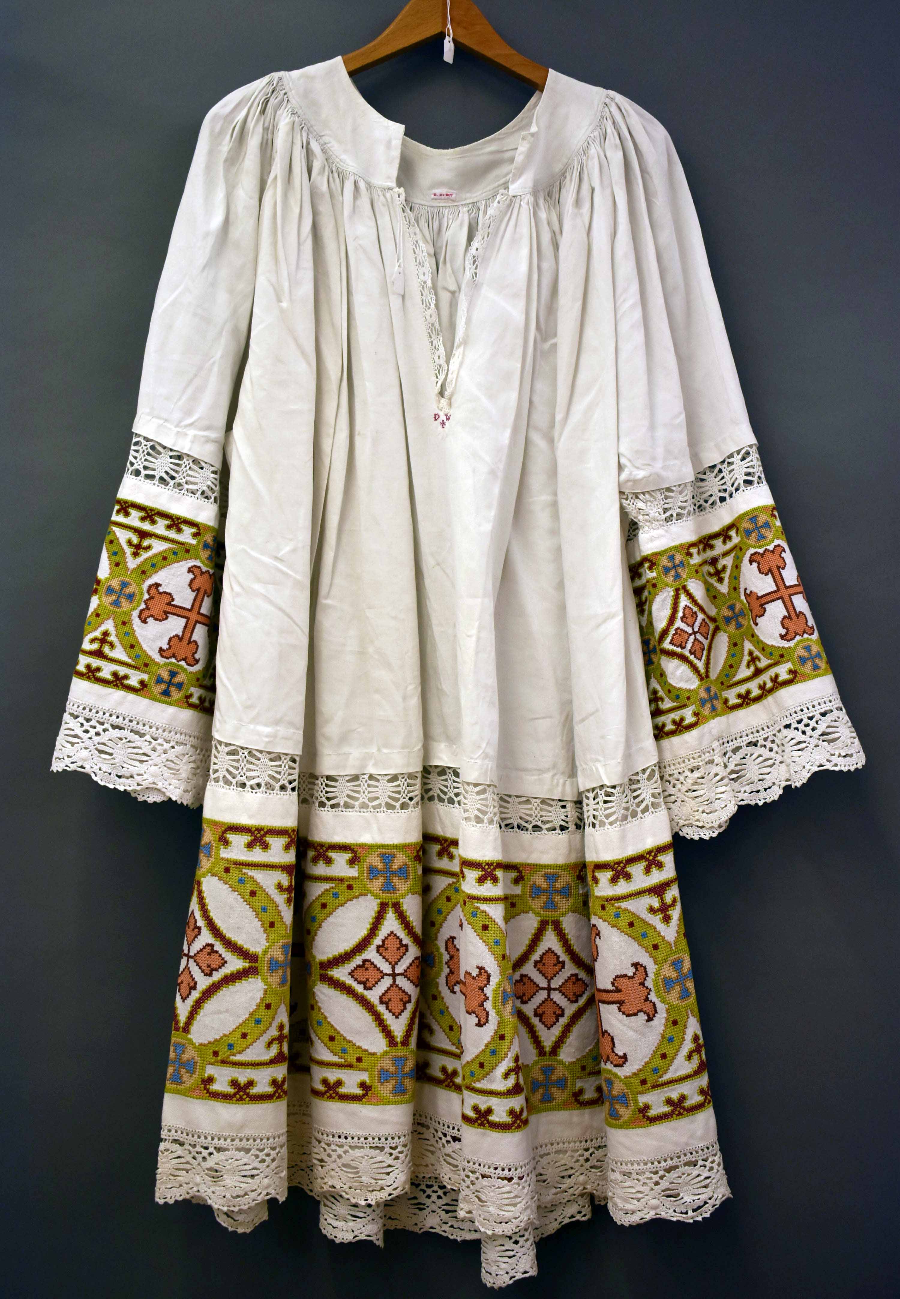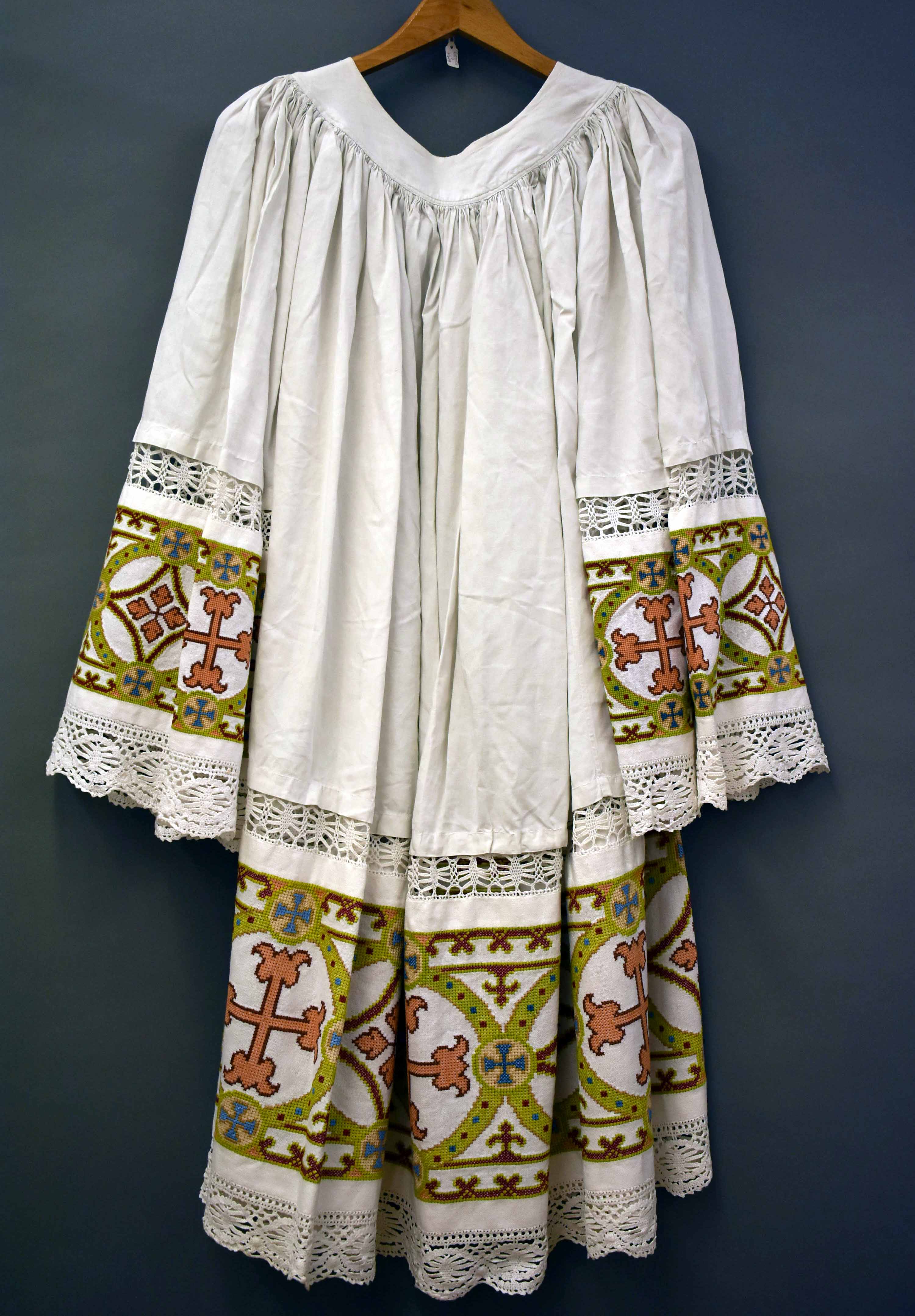 Superplie in kruissteek geborduurd met roze kruisen in groene cirkels