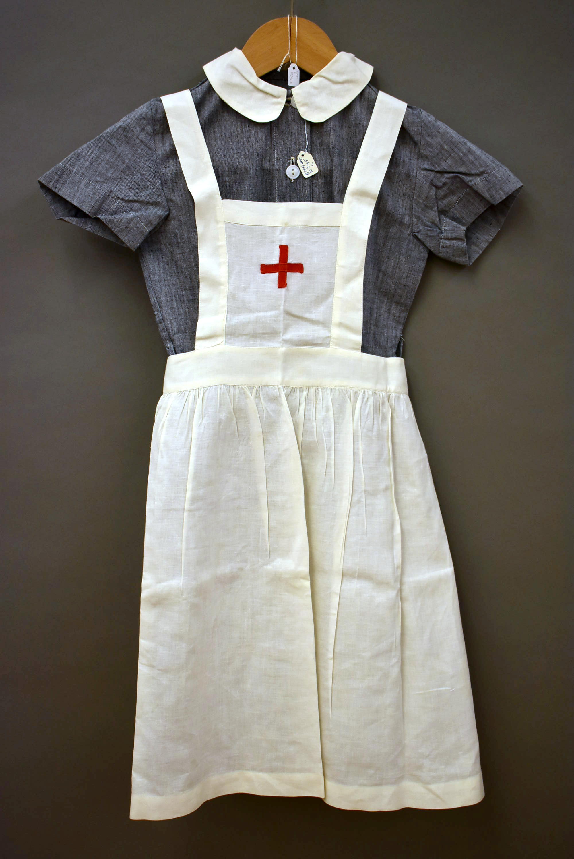 Kleding kindsheid, blauw-wit denim verpleegstersuniform, korte mouwen, witte kraag