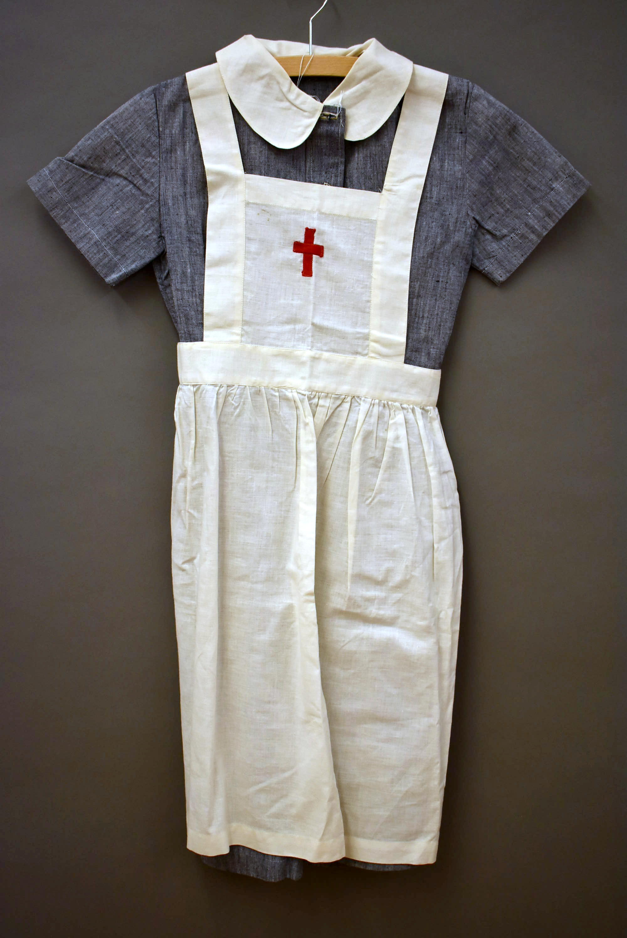 Kleding kindsheid, blauw-wit denim verpleegstersuniform, korte mouwen, witte kraag