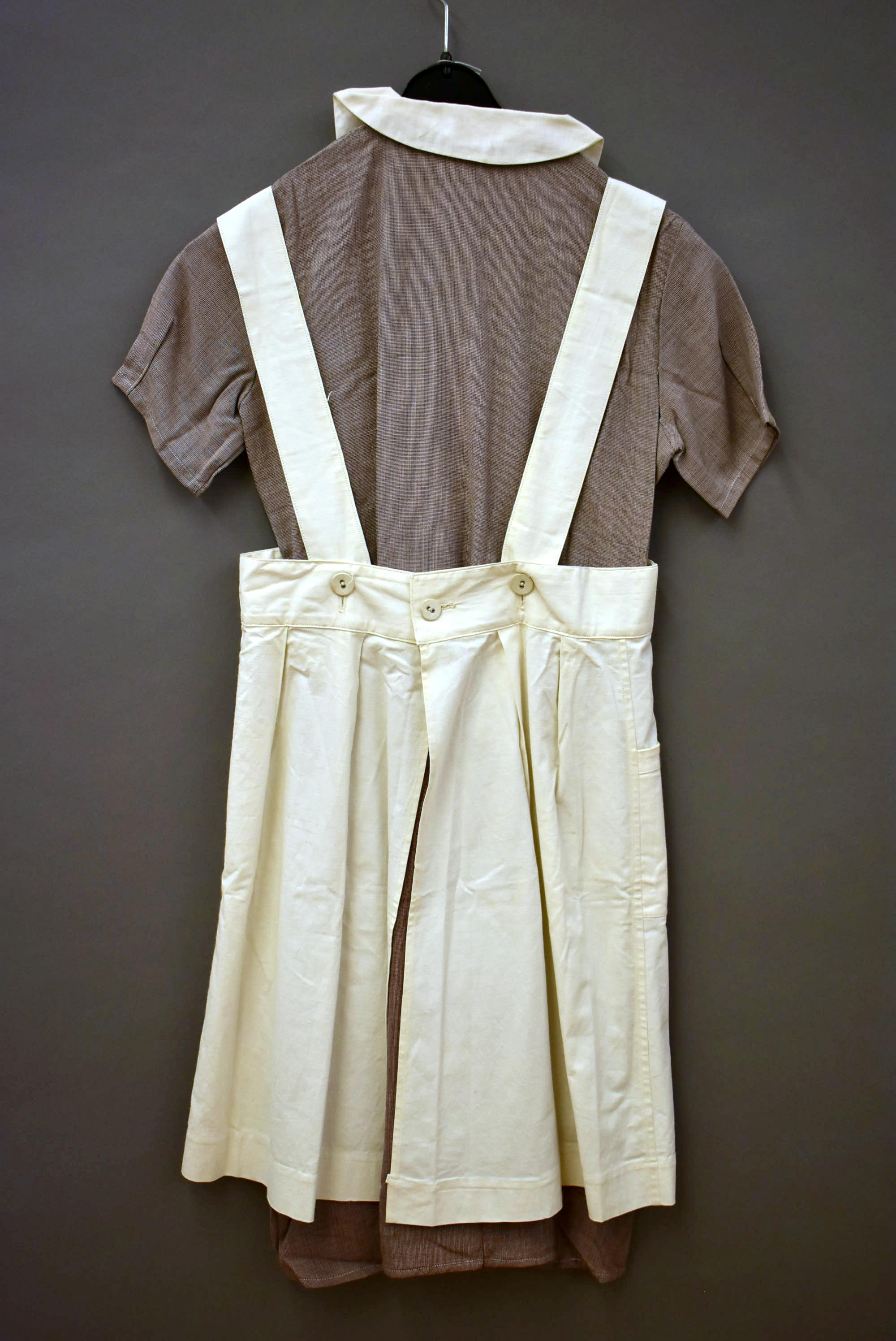 Kleding kindsheid, bruin-wit verpleegstersuniform, witte kraag, ceintuur
