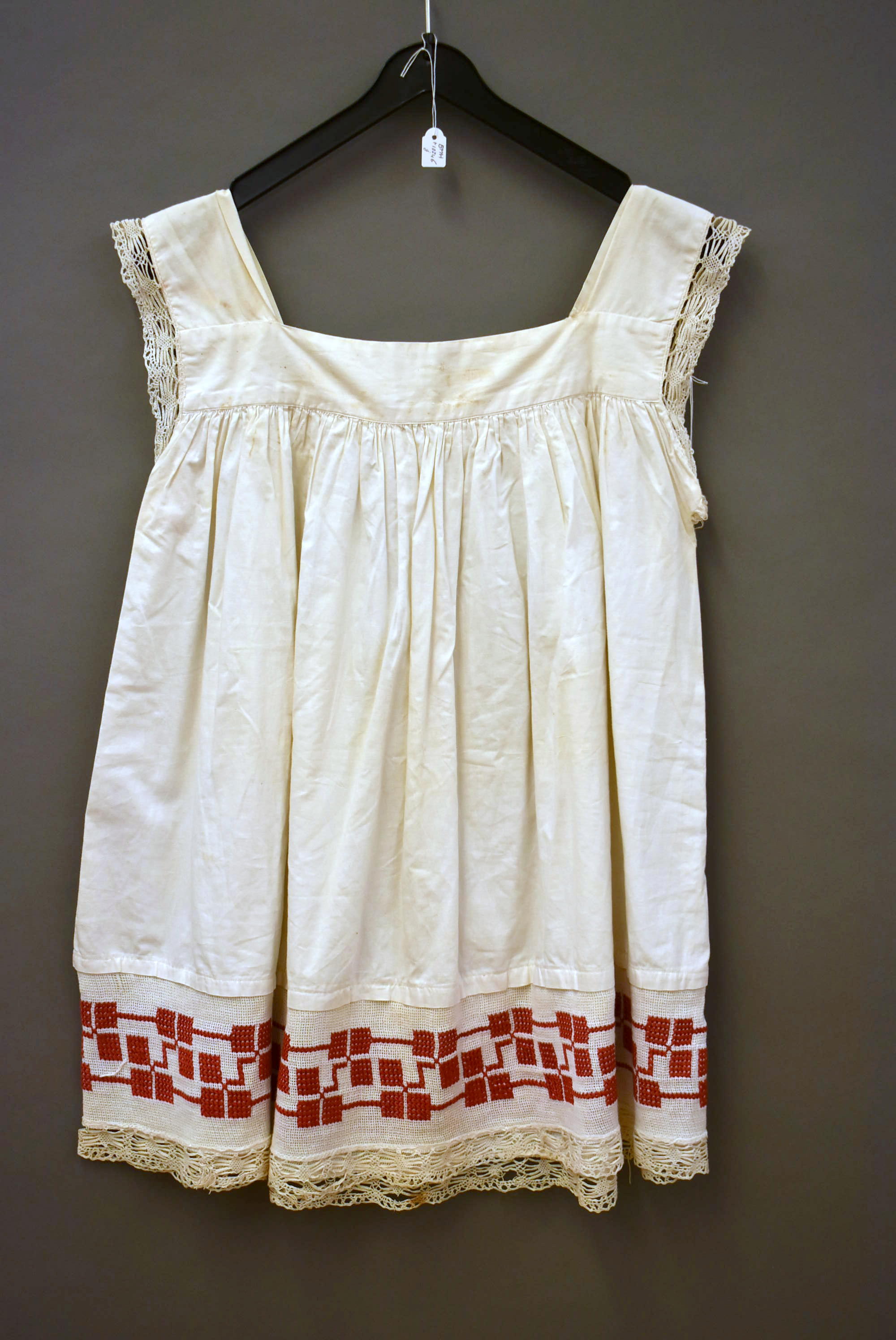 Wit mouwloos hemd met vierkante hals, afgezet met kant, patroon in rood en roze kruissteek