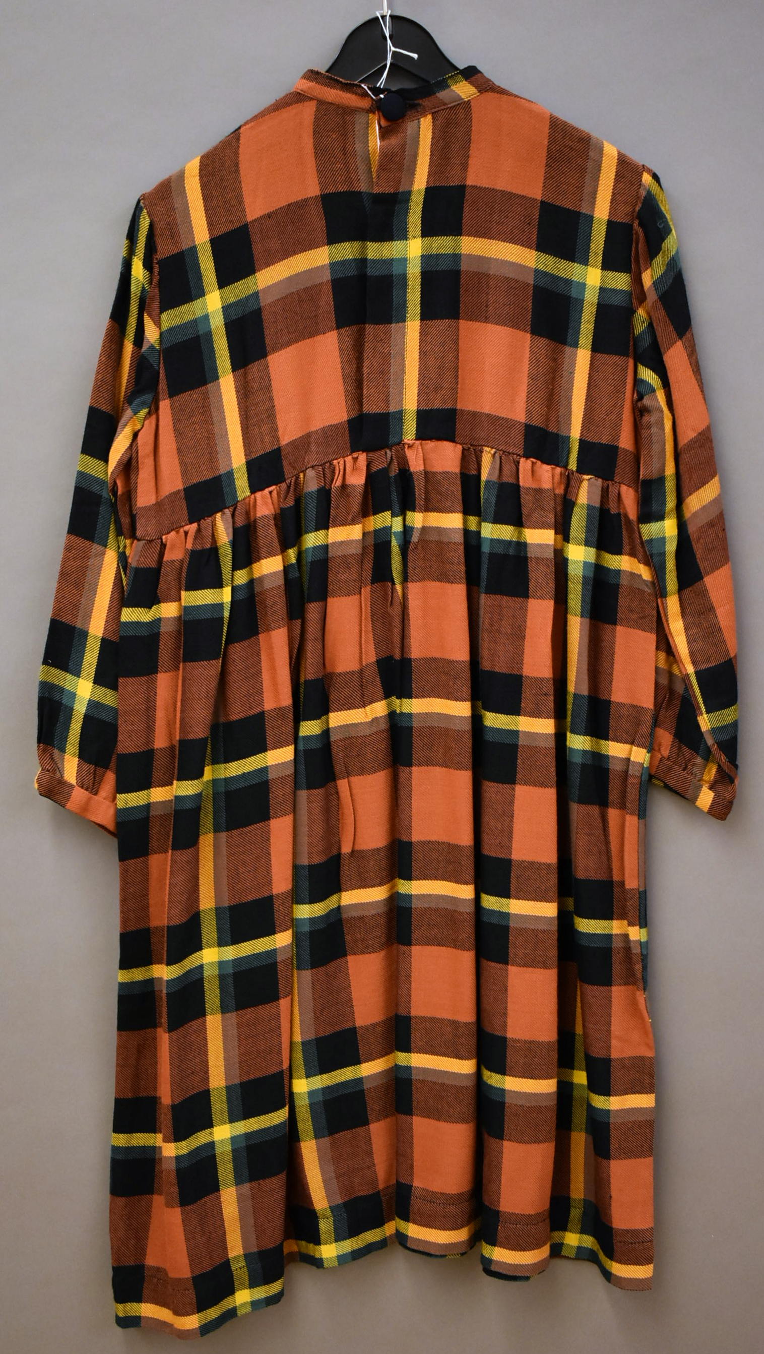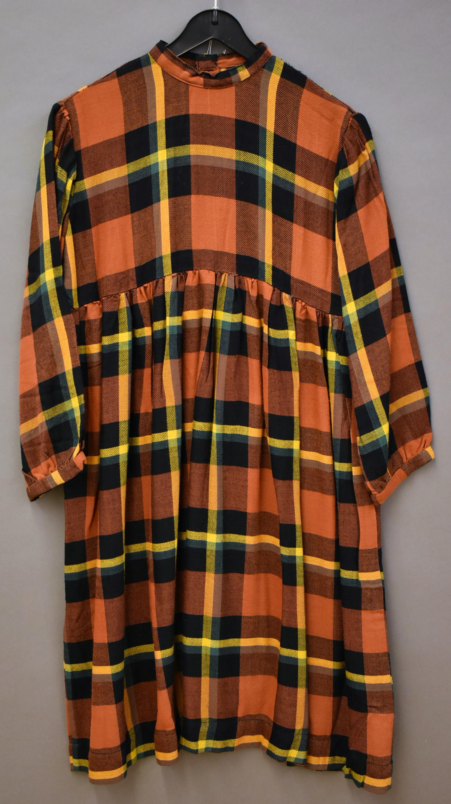 Kleding kindsheid, jurkje met lange mouwen, bruin-geel-groen geruit
