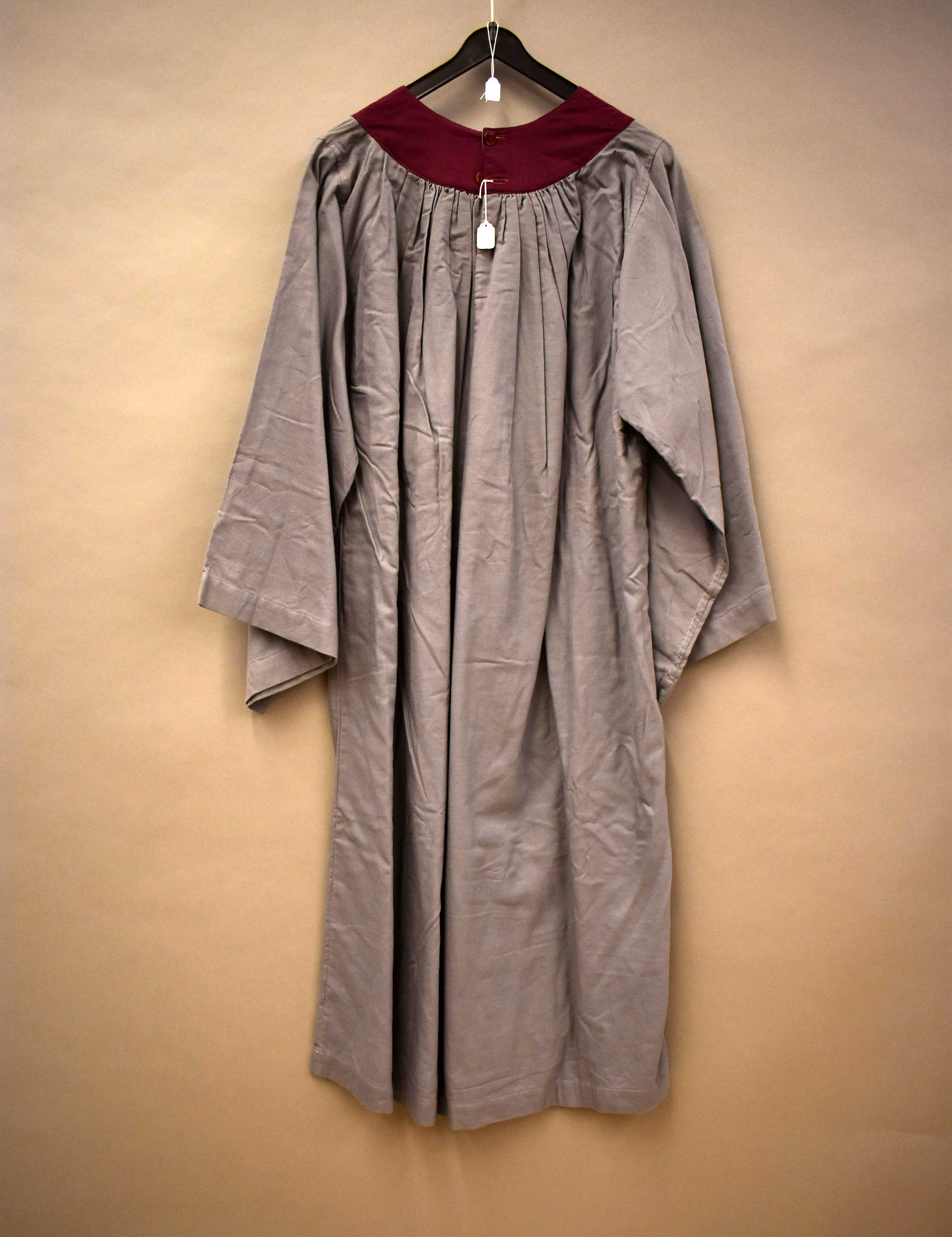 Kleding kindsheid, grijs kleed van een tot slaaf gemaakte, donkerrood afgebiesd