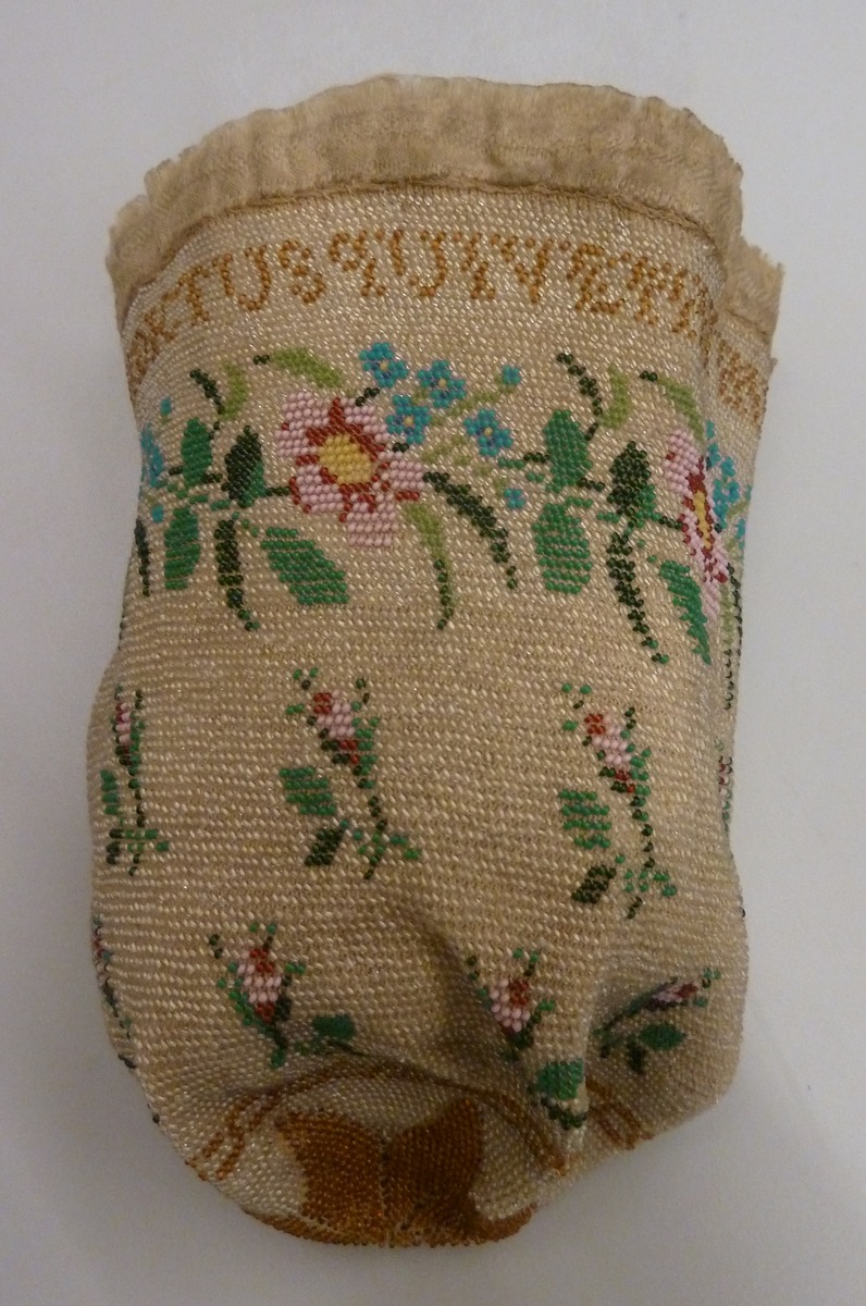 Witte ziekenbeurs met bloemtakken en "Benedictus Qui Venit In Nomine Domini" in kralen