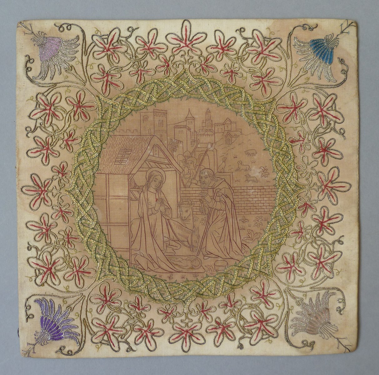 Witte palla met geboorte van Christus omgeven door doornenkroon en bloemranken