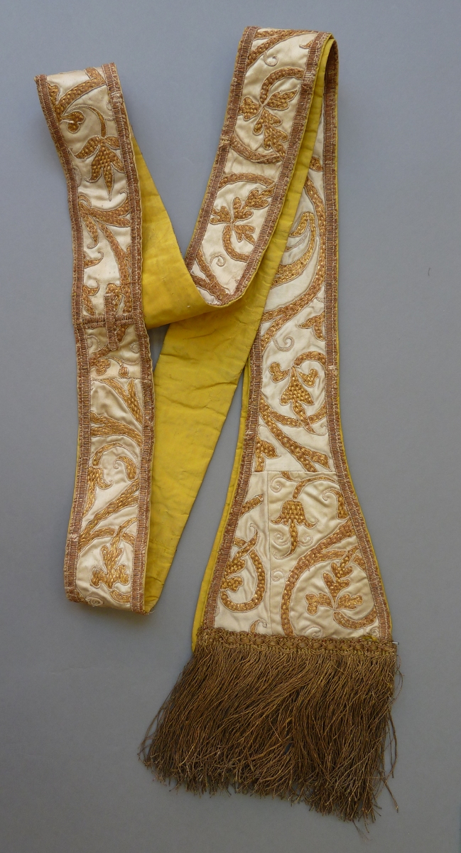 Witte stola met goudfranje en borduursel van bloemen en ranken