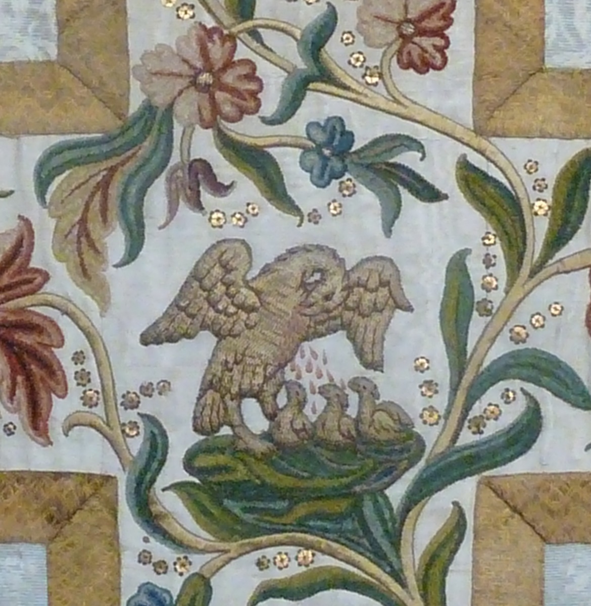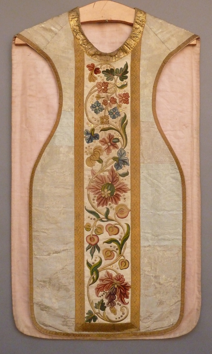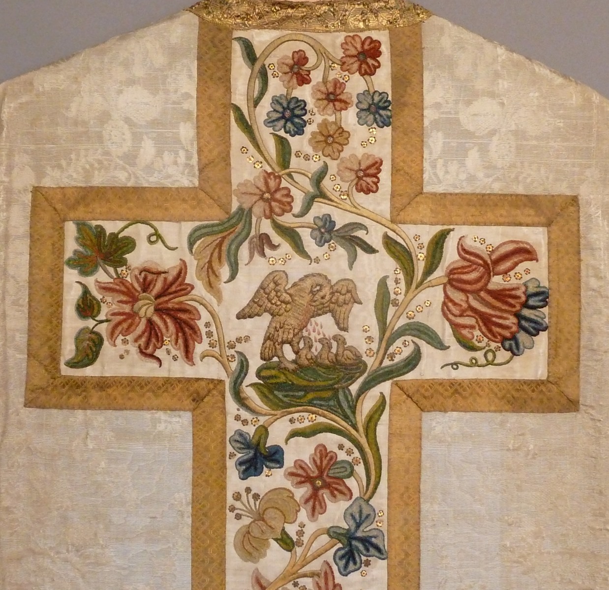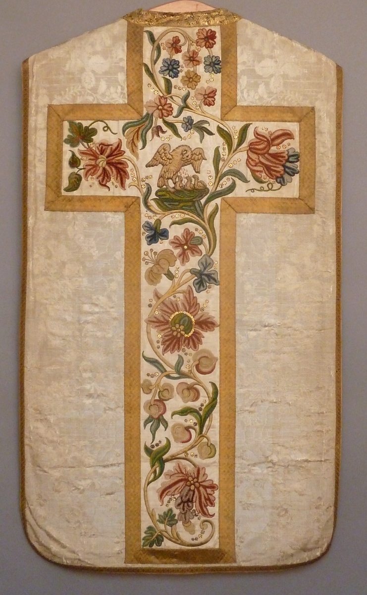 Wit kazuifel met chenilleborduursel van bloemranken en pelikaan
