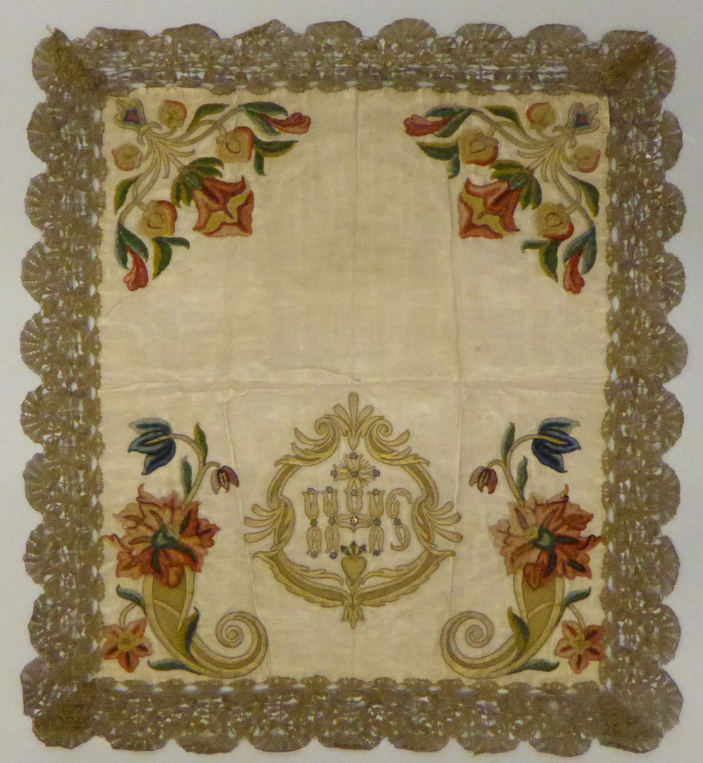 Wit kelkvelum met bloemen in chenille, IHS in volutenrand in gouddraad