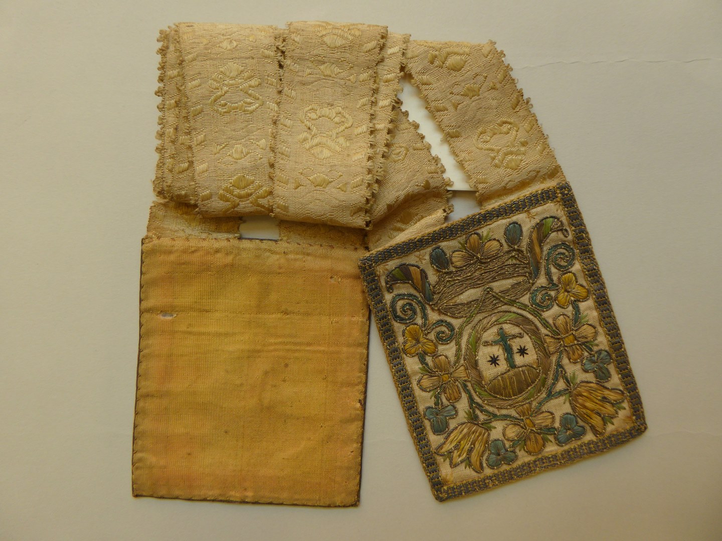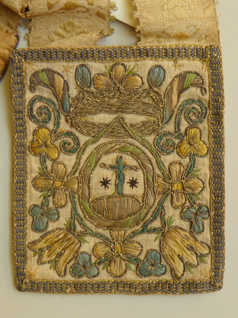 Scapulier geborduurd met gekroond medaillon, met kruis en bloemranken
