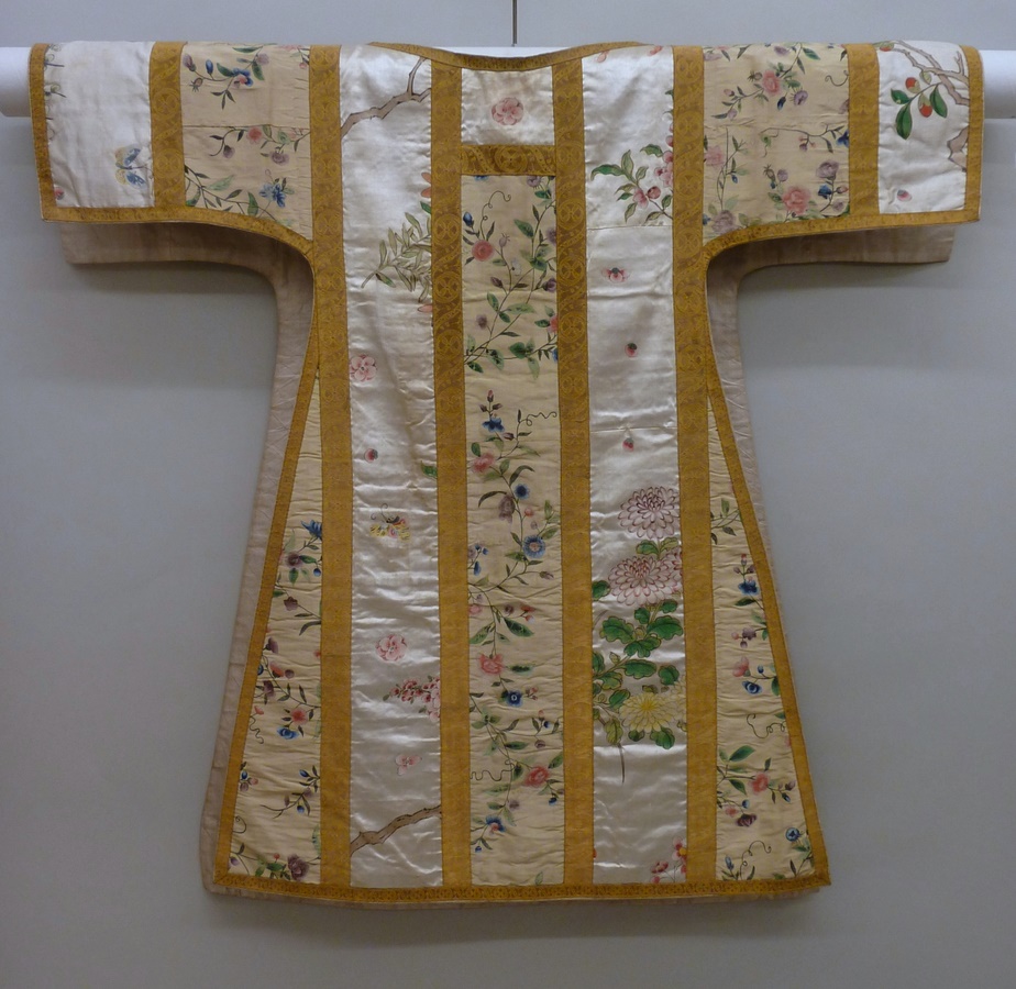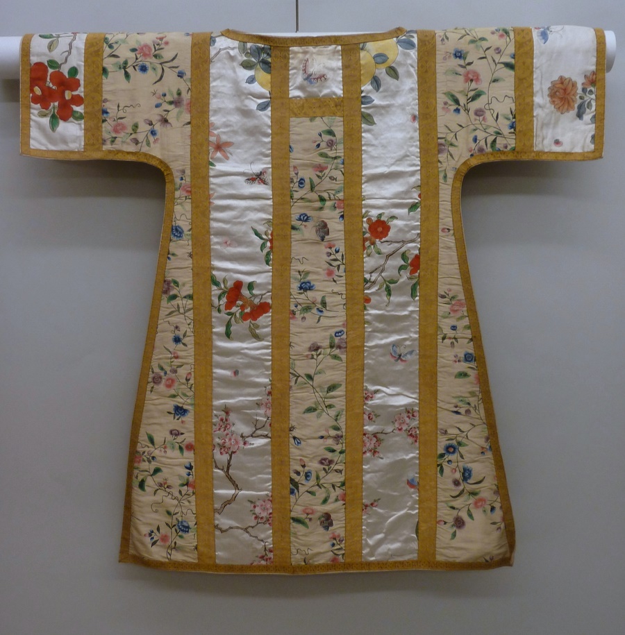 Crème-witte dalmatiek met geschilderde bloemen en vlinders en goudgalon