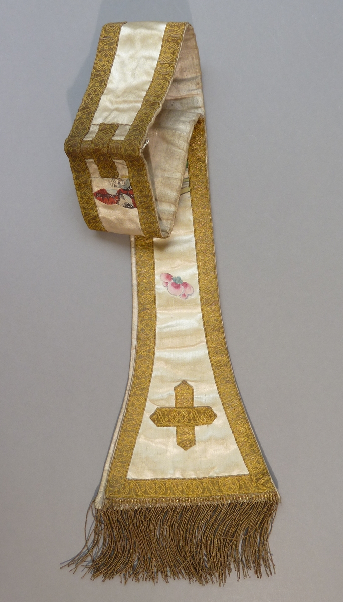 Witte manipel met geschilderde bloemen en vlinder, goudgalon kruisjes en rand