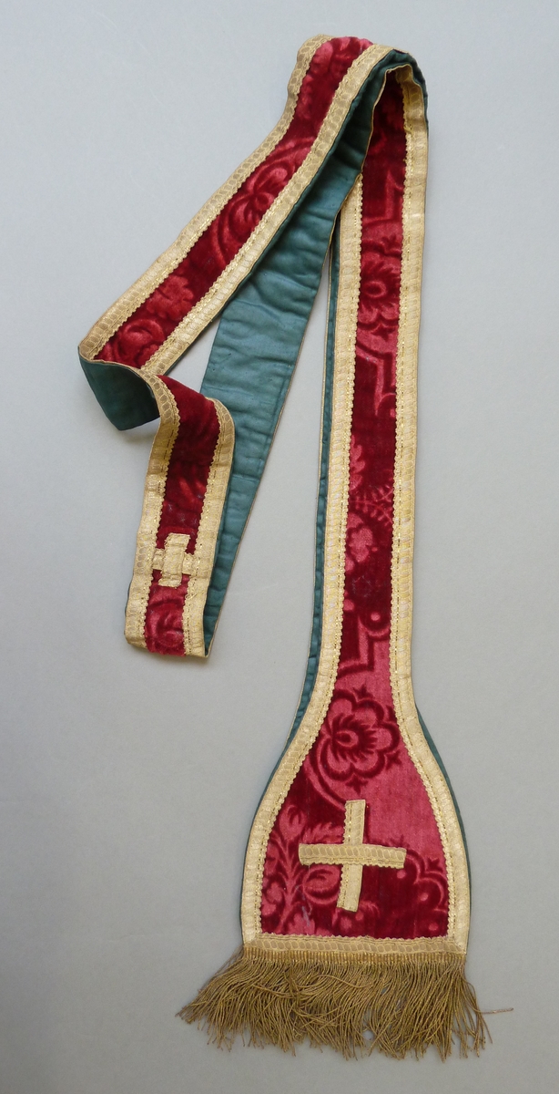 Rode stola met geschoren rankenpatroon, kruisjes en rand van goudgalon