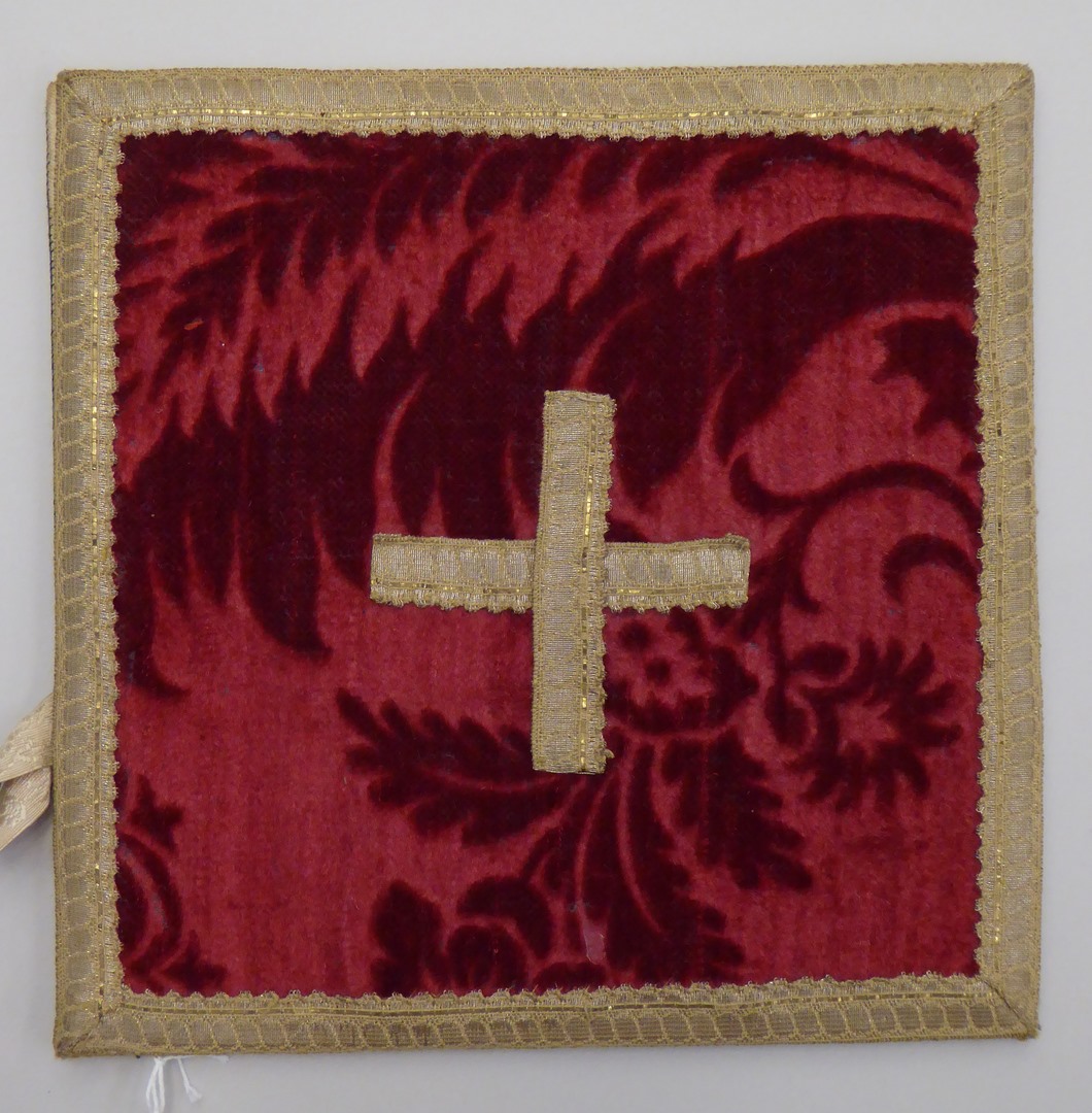 Rode beurs met geschoren rankenmotief, kruis en rand van goudgalon