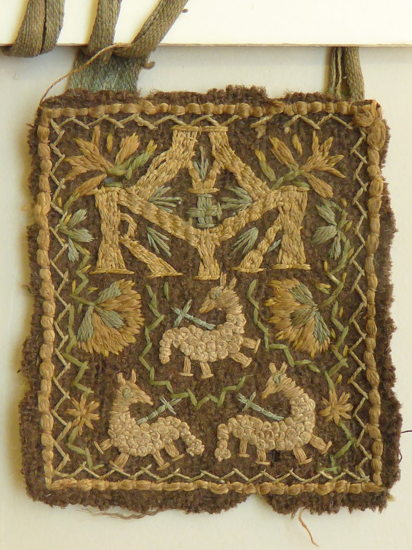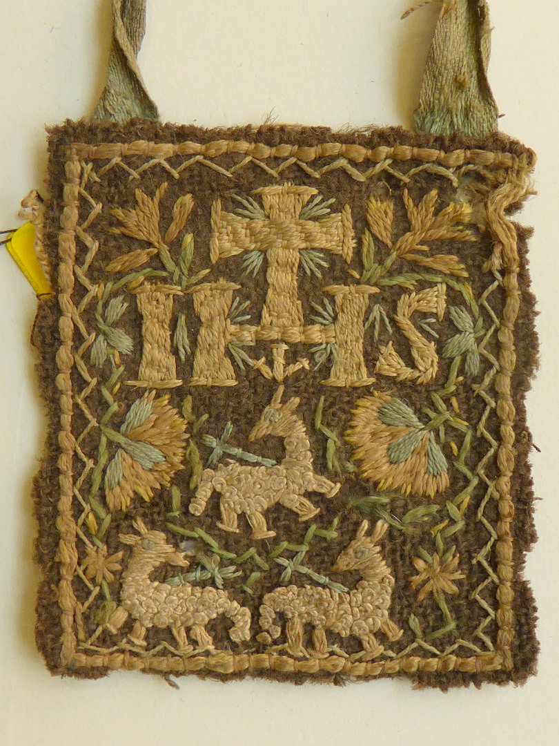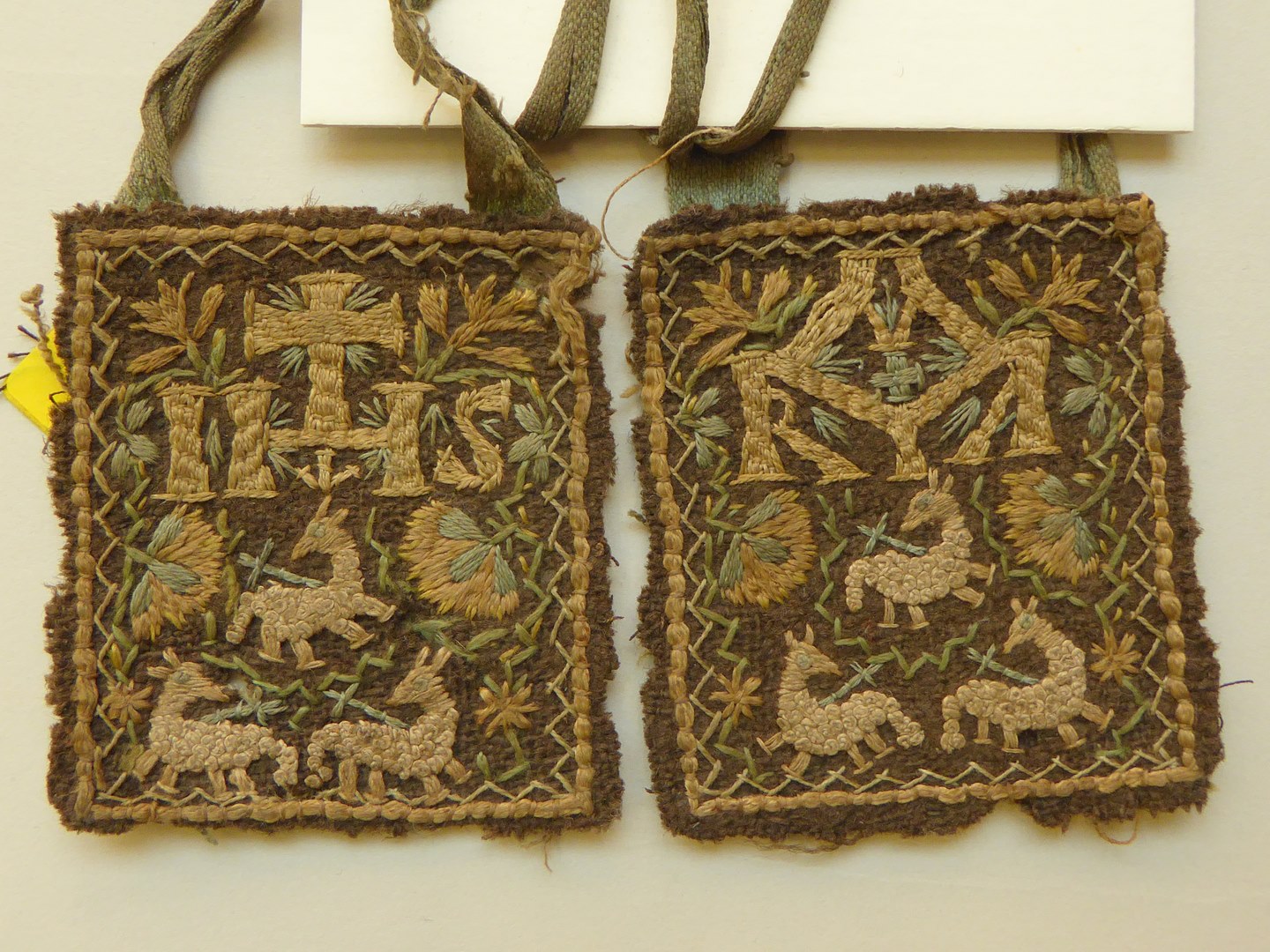 Bruin scapulier met "IHS" en "Maria", met drie lammeren Gods