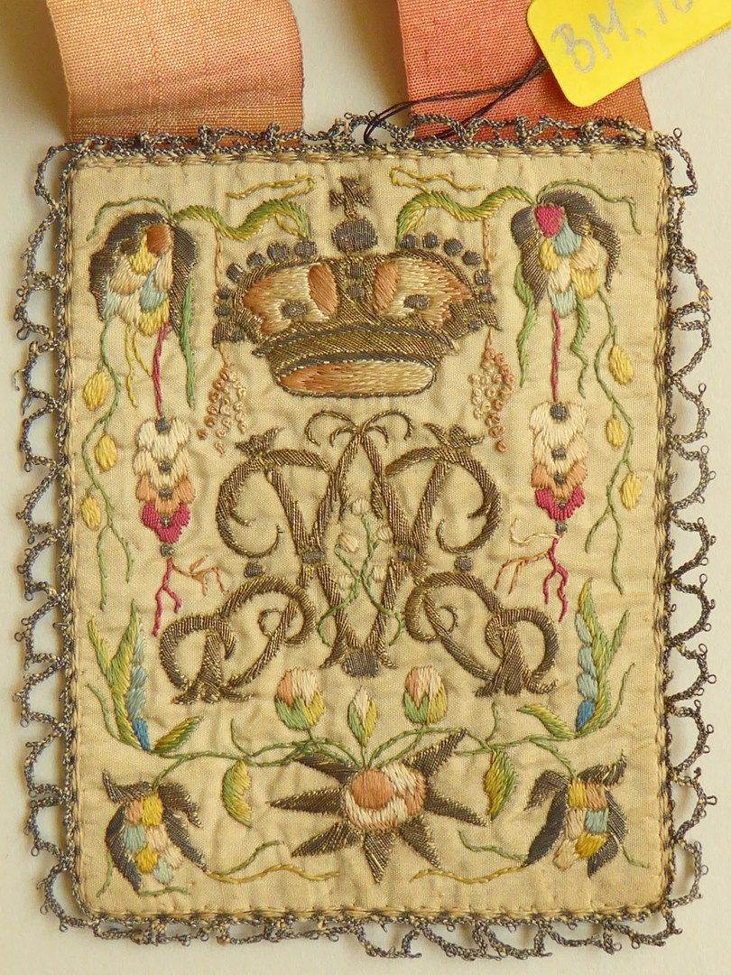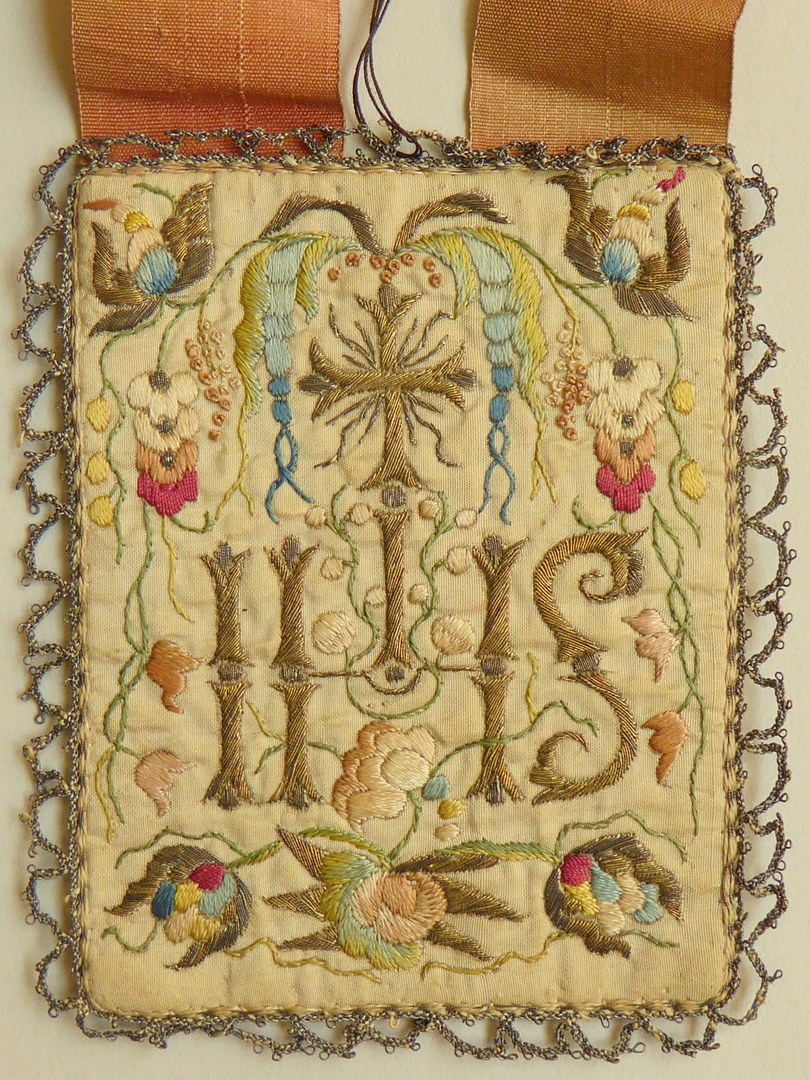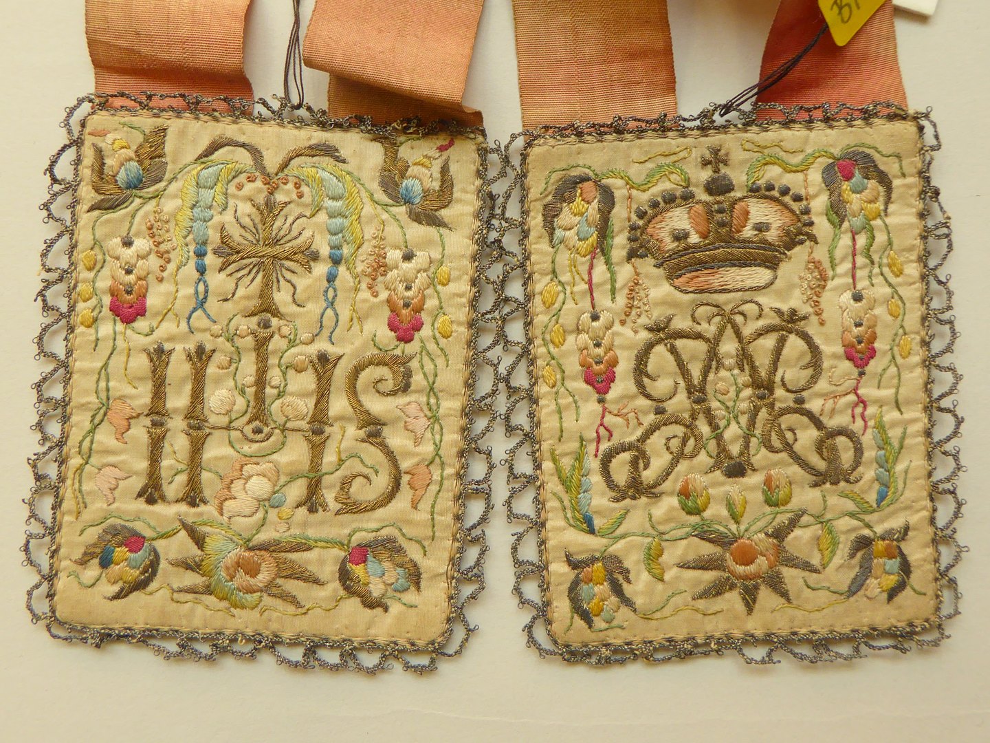 Scapulier met monogrammen "IHS" en "M.R." en rood lint