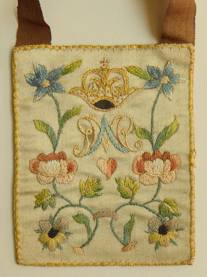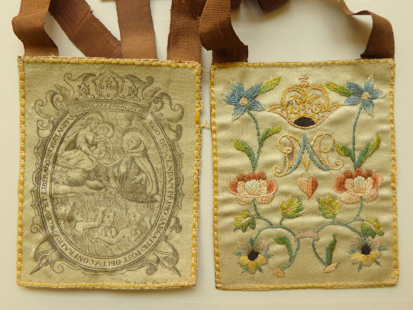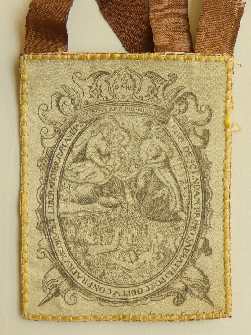 Karmel-scapulier bedrukt met visioen van Maria aan Jacobus d'Osa, half geborduurd, bruine linten
