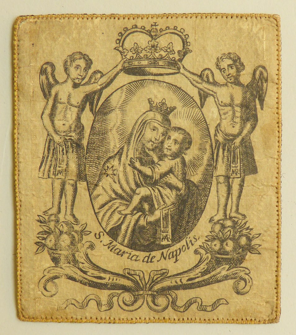 Scapulier (helft) met O.L.V. van de Karmel (van Napels) met twee putti met kroon en cornucopiae