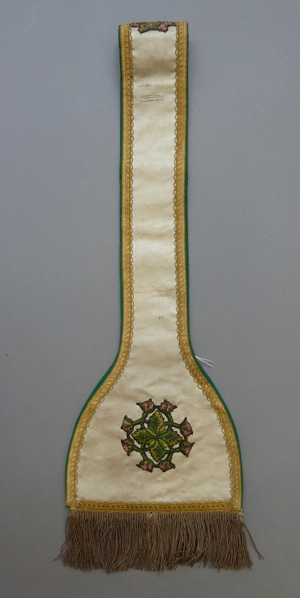 Witte manipel met geborduurde applicaties van vier bladeren omringd door rozenranken