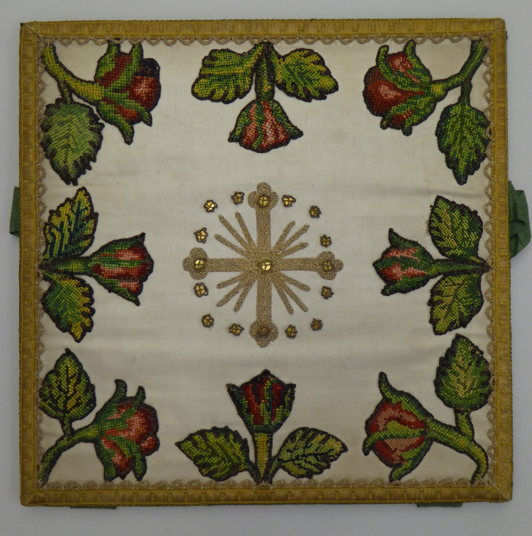 Witte beurs met geborduurde applicaties van rozen, gouddraad kruisje
