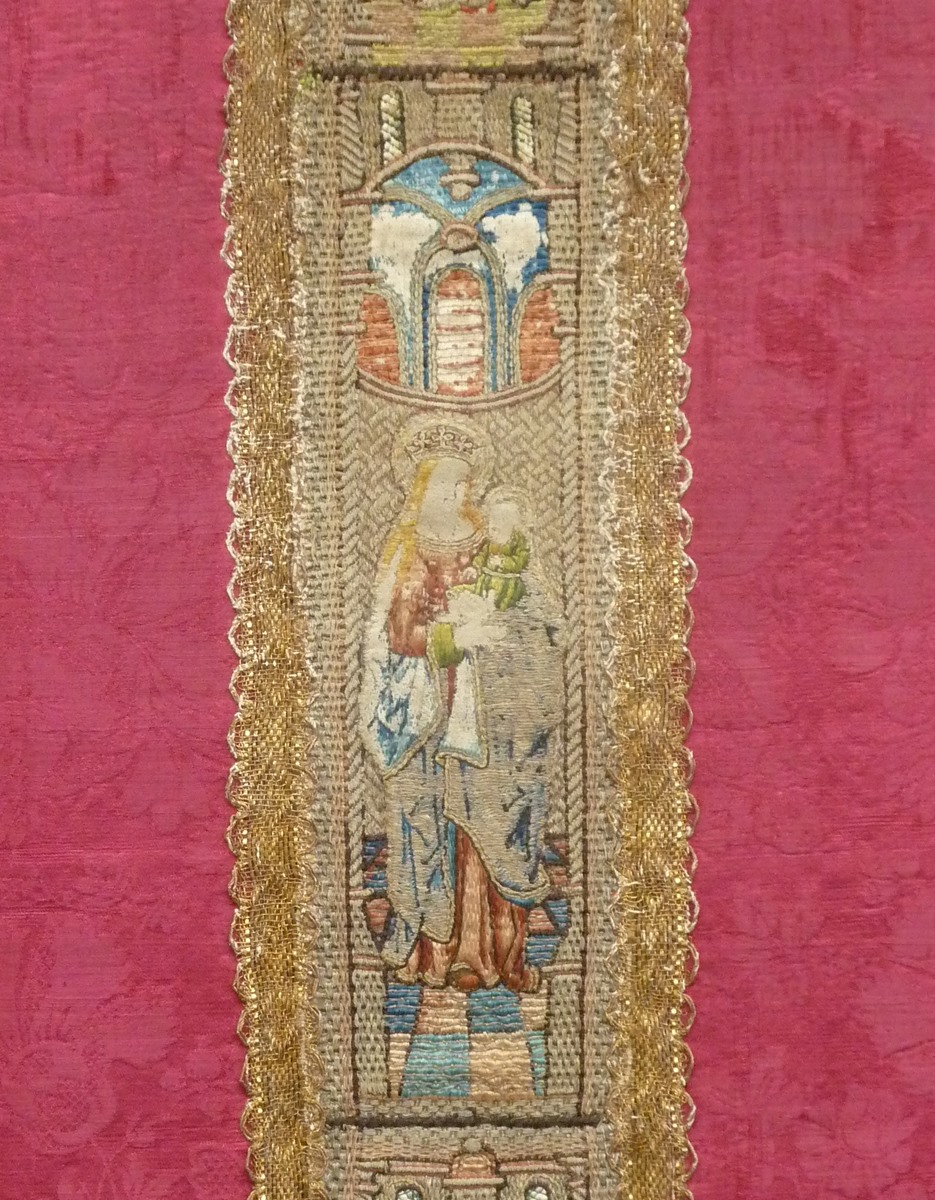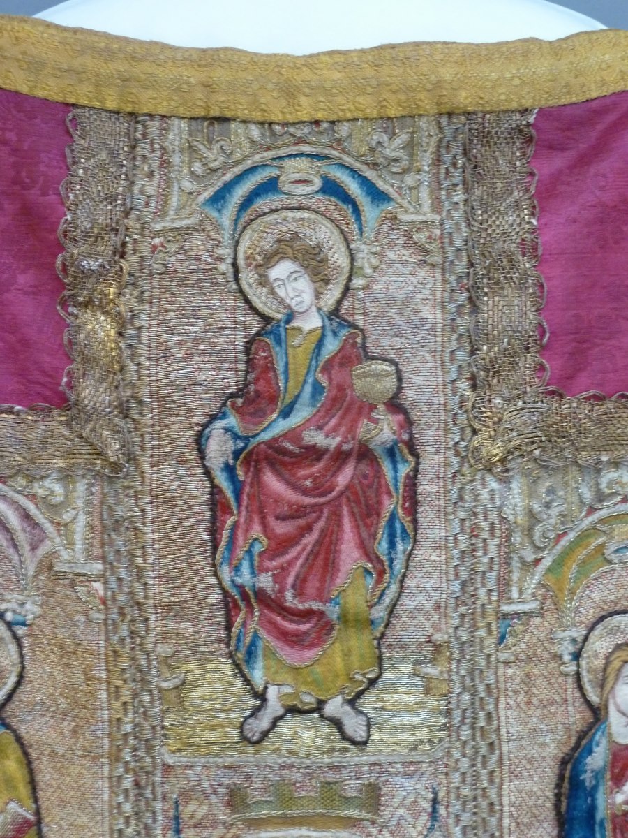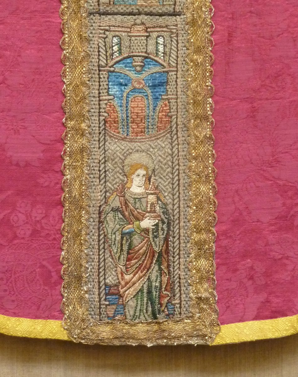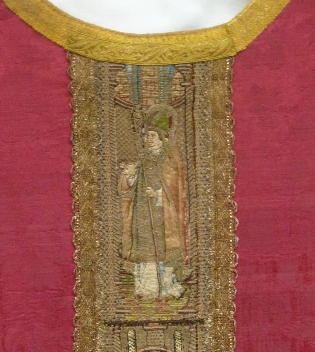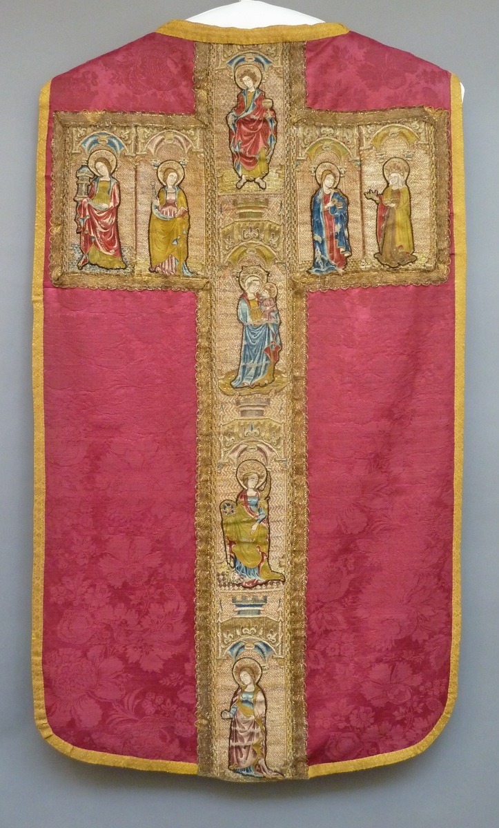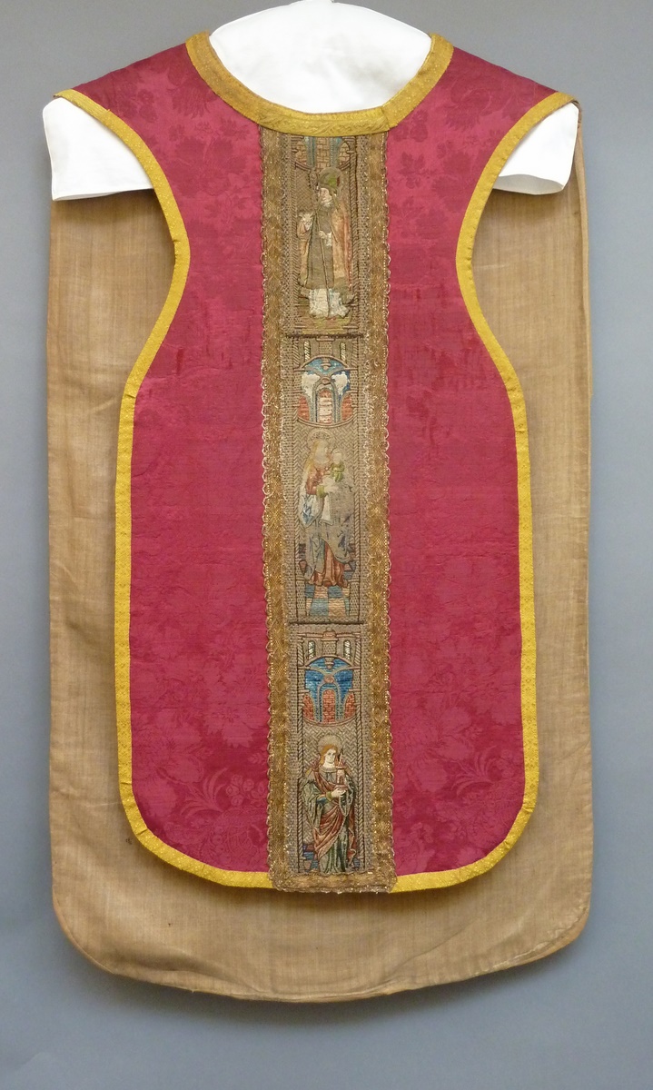 Rood kazuifel met geborduurde heiligen en ingeweven bloemmotief