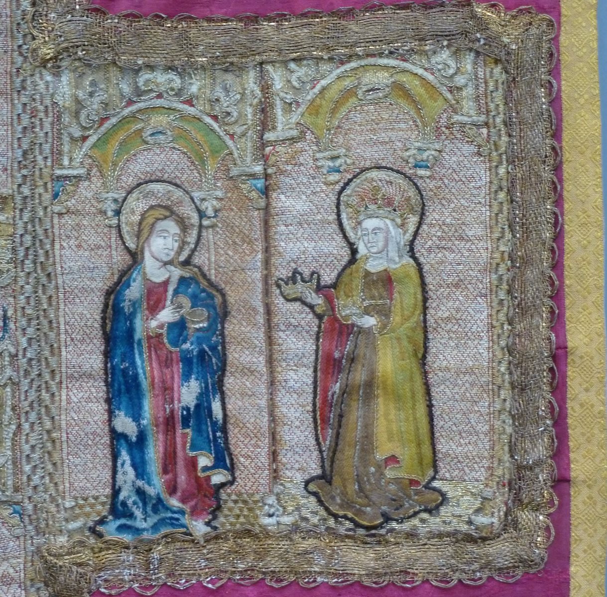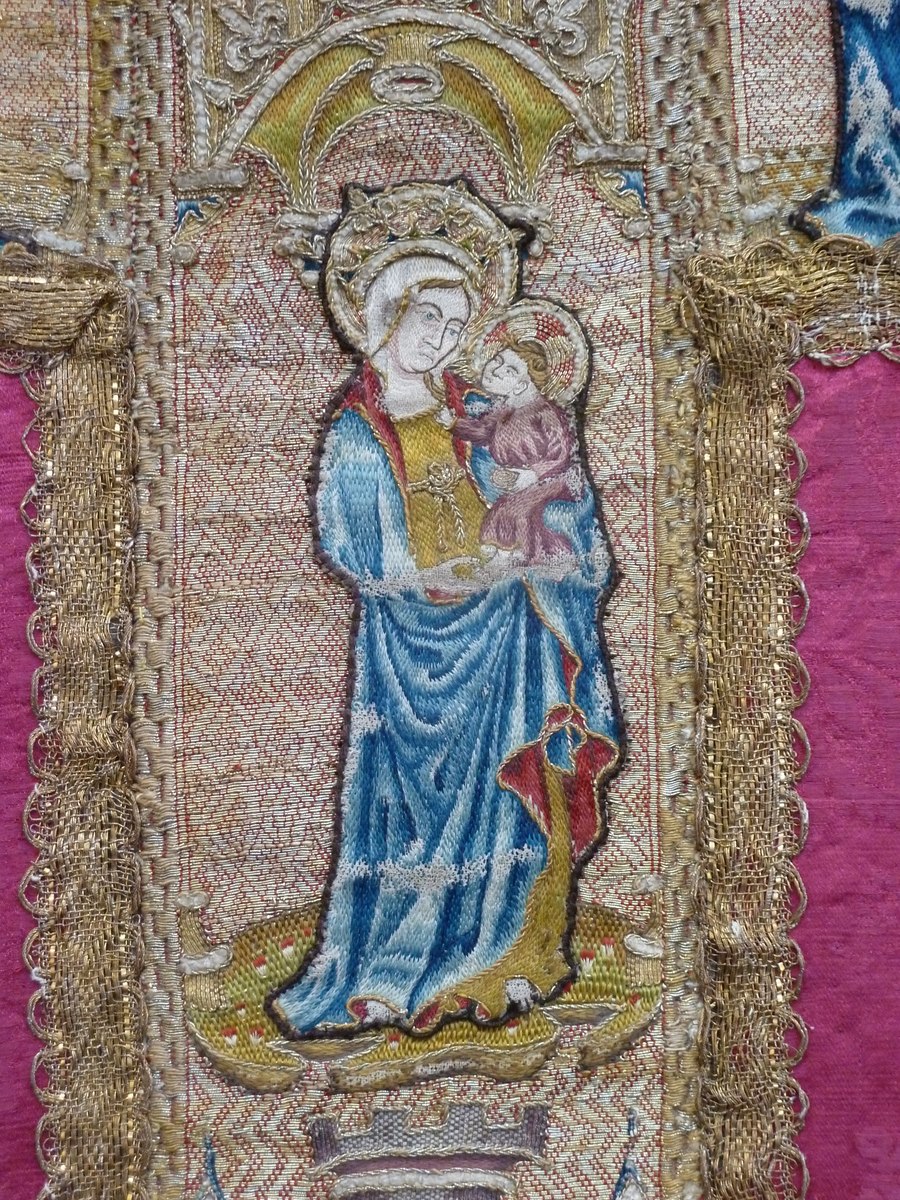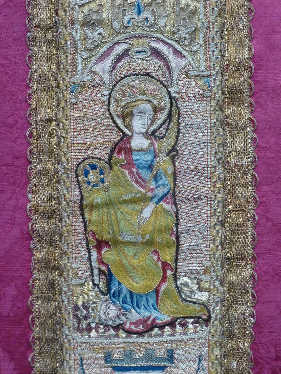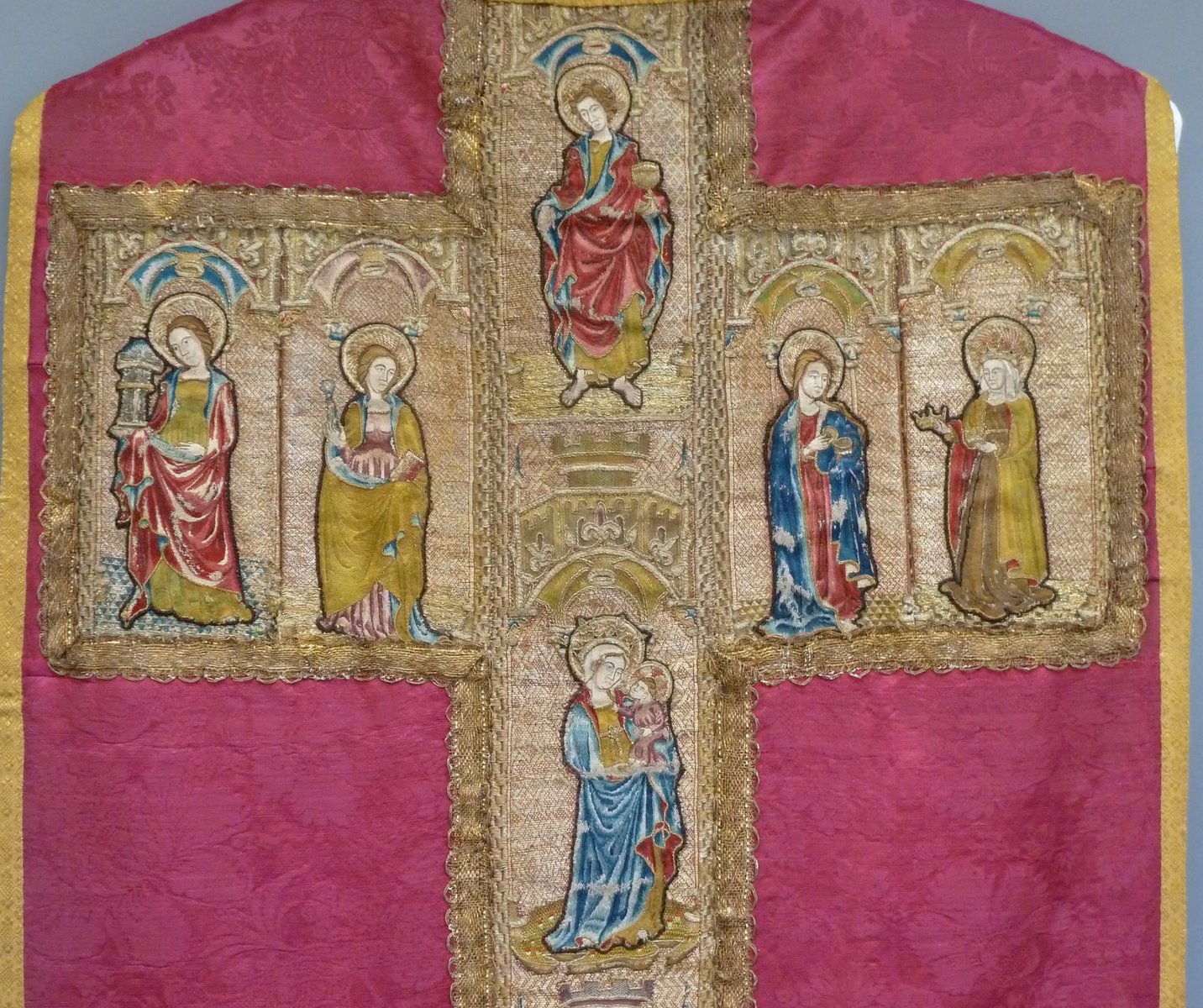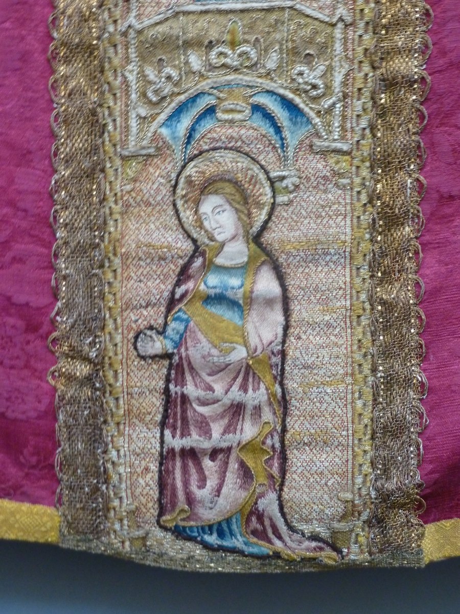 Rood kazuifel met geborduurde heiligen en ingeweven bloemmotief
