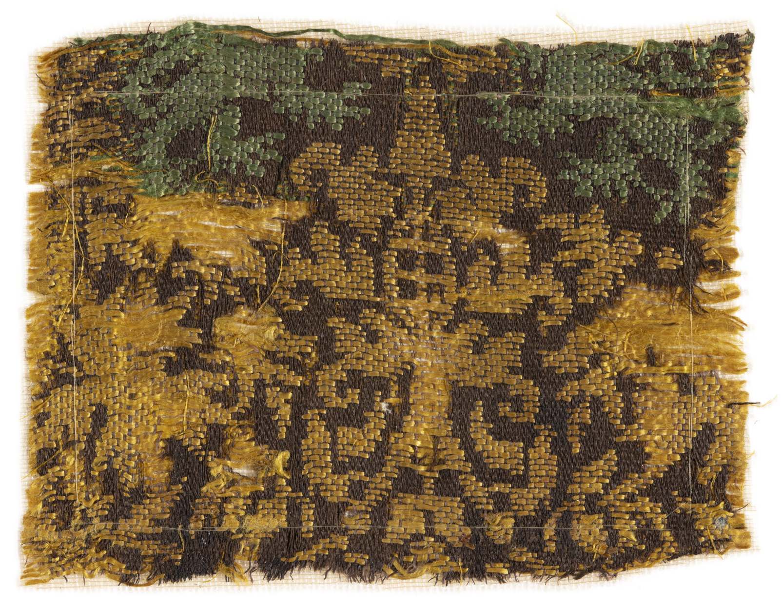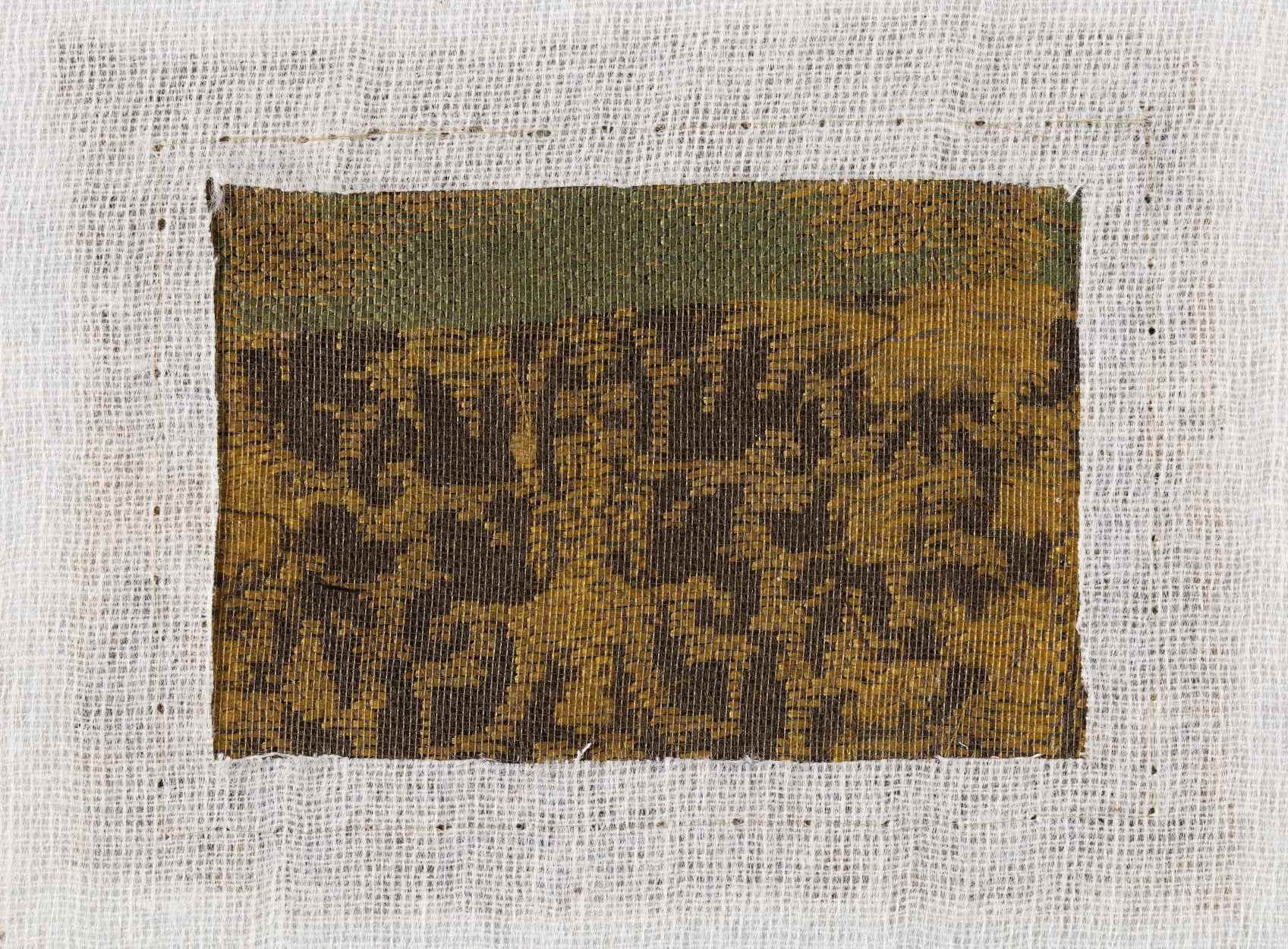 Reliekomhulsel, fragment bruinachtige grond, waarop geel bladwerk, erboven twee groene klimmende leeuwtjes (zonder kop), omwindsel uit verzameling relieken H. Jeroen en H. Adelbert